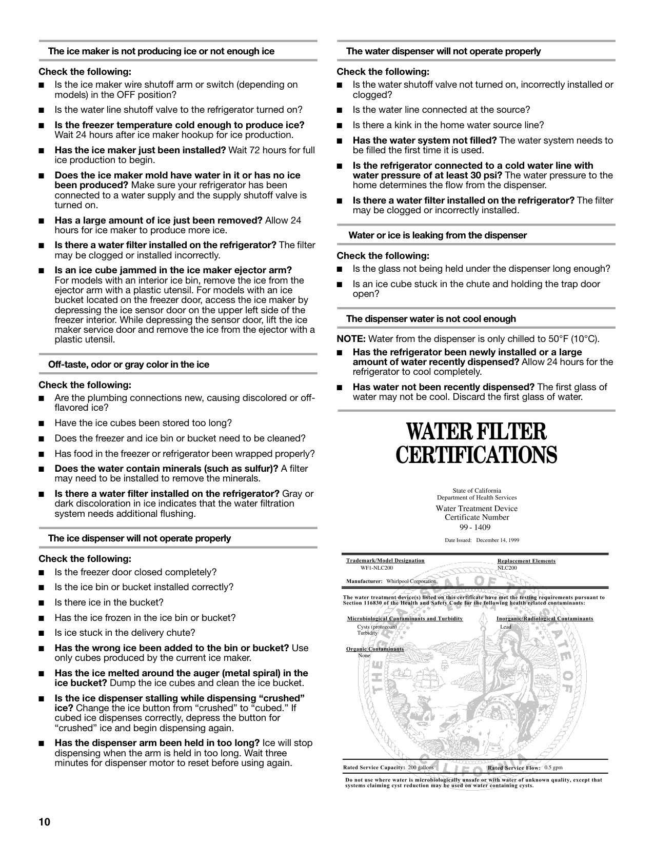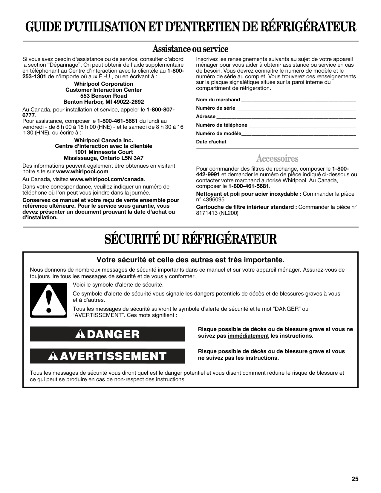 Assistance or Service If you need assistance or service, first see the “Troubleshooting” section. Additional help is available by calling our Customer Interaction Center at 1-800-253-1301 from anywhere in the U.S.A., or write: Whirlpool Corporation Customer Interaction Center 553 Benson Road Benton Harbor, MI 49022-2692 In Canada, for installation and service call, 1-800-807-6777. For assistance call 1-800-461-5681 Monday to Friday 8:00 a.m. - 6:00 p.m. (EST) Saturday 8:30 - 4:30 p.m. (EST), or write: Whirlpool Canada Inc. Customer Interaction Center 1901 Minnesota Court Mississauga, Ontario L5N 3A7 Information may also be obtained by visiting our website at www.whirlpool.com. In Canada, visit www.whirlpool.com/canada. Please include a daytime phone number in your correspondence. Keep this book and your sales slip together for future reference. You must provide proof of purchase or installation date for in-warranty service. Write down the following information about your appliance to help you obtain assistance or service if you ever need it. You will need to know your complete model number and serial number. You can find this information on the model and serial number label, located on the inside wall of the refrigerator compartment. Dealer name____________________________________________________ Serial number __________________________________________________ Address ________________________________________________________ Phone number__________________________________________________ Model number __________________________________________________ Purchase date __________________________________________________ Accessories To order replacement filters, call 1-800-442-9991 and ask for the part number listed below or contact your authorized Whirlpool dealer. In Canada, call 1-800-461-5681. Stainless Steel Cleaner and Polish: Order Part #4396095 Standard Interior Filter Cartridge: Order Part #8171413 (NL200) Table of Contents / Índice / Table des matièresAssistance Or Service ............................ 1