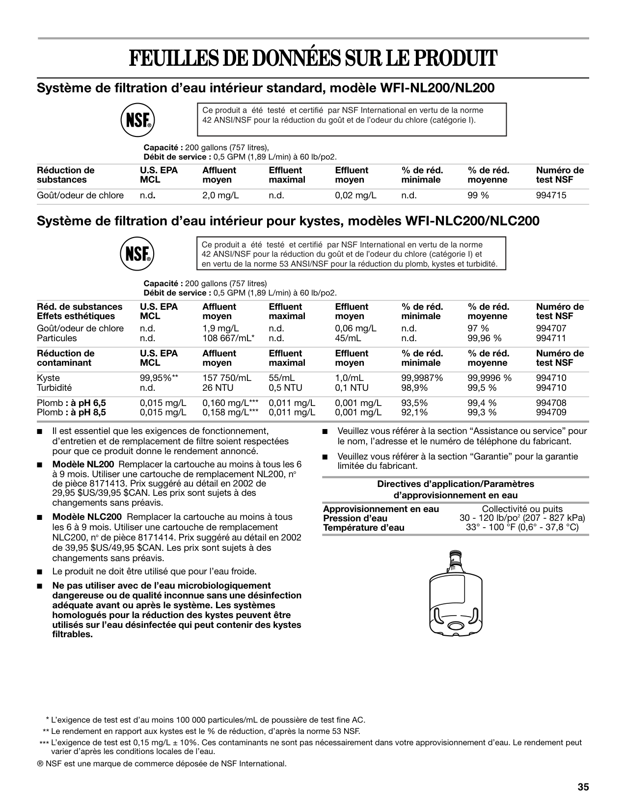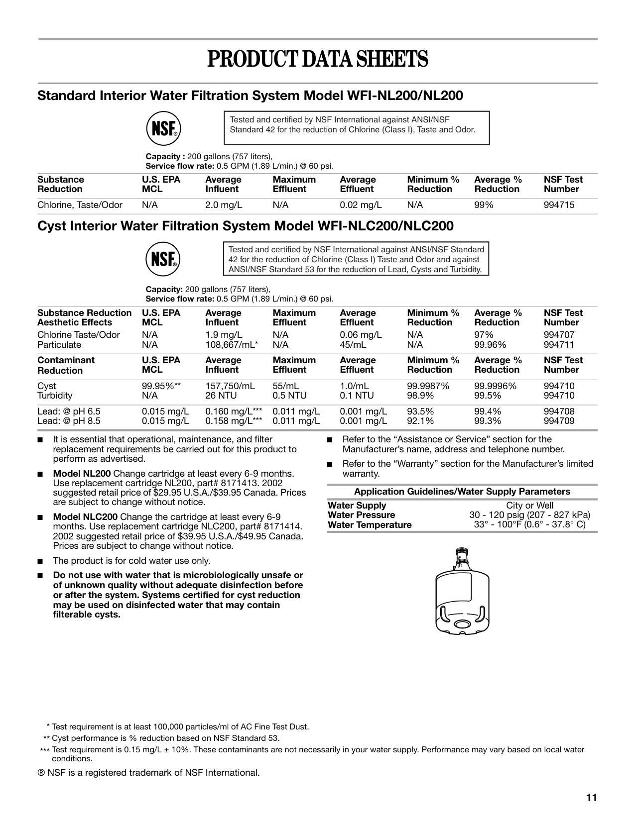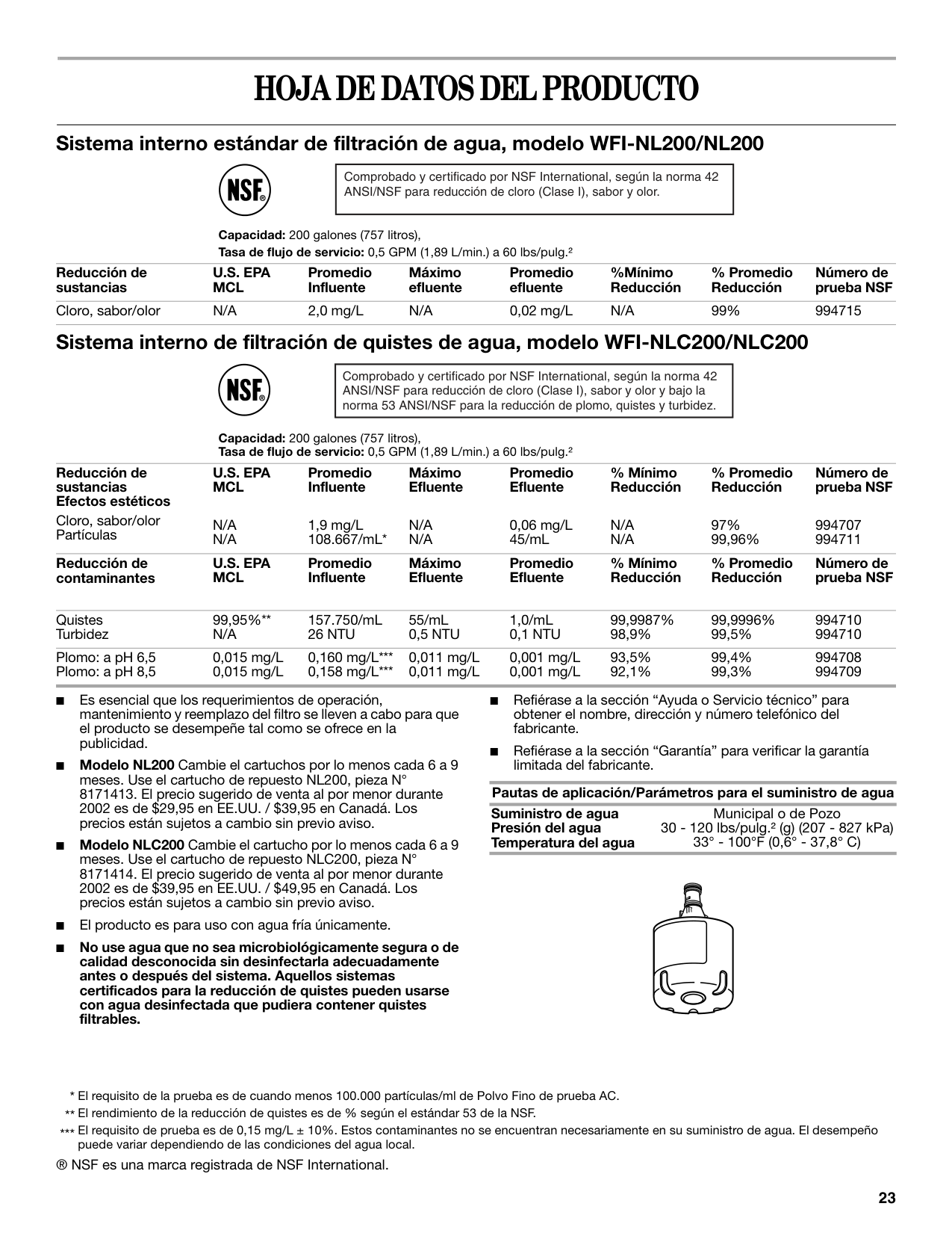 Sistema interno estándar de filtración de agua, modelo WFI-NL200/NL200 Capacidad: 200 galones (757 litros), Tasa de flujo de servicio: 0,5 GPM (1,89 L/min.) a 60 lbs/pulg.² Sistema interno de filtración de quistes de agua, modelo WFI-NLC200/NLC200 Capacidad: 200 galones (757 litros), Tasa de flujo de servicio: 0,5 GPM (1,89 L/min.) a 60 lbs/pulg.² ■ Es esencial que los requerimientos de operación, mantenimiento y reemplazo del filtro se lleven a cabo para que el producto se desempeñe tal como se ofrece en la publicidad. ■ Modelo NL200 Cambie el cartuchos por lo menos cada 6 a 9 meses. Use el cartucho de repuesto NL200, pieza N°U.S. Epa