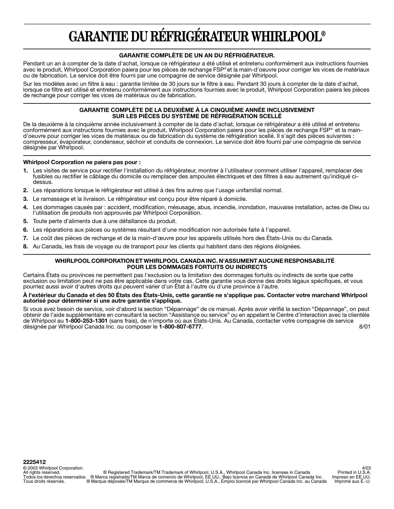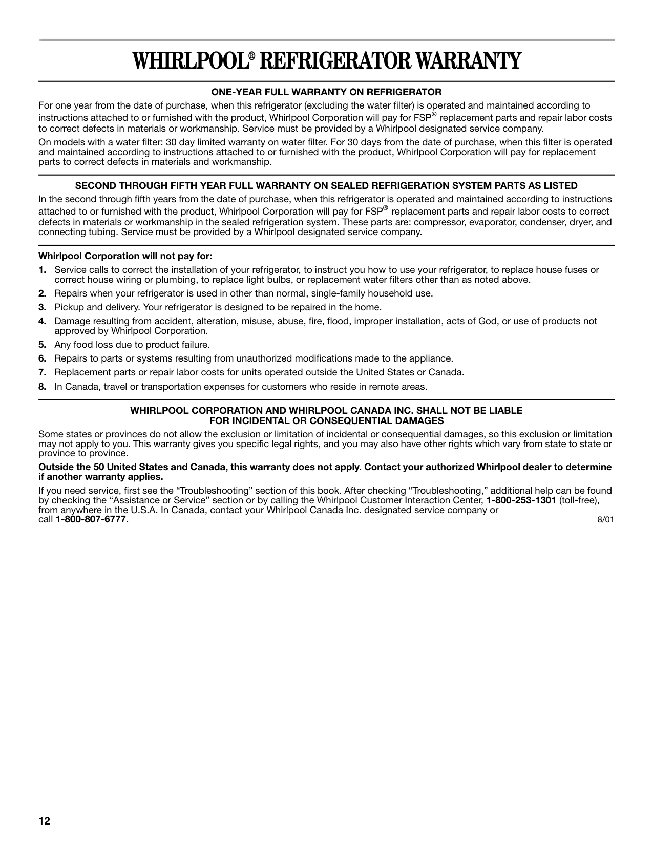 For one year from the date of purchase, when this refrigerator (excluding the water filter) is operated and maintained according to instructions attached to or furnished with the product, Whirlpool Corporation will pay for FSP® replacement parts and repair labor costs to correct defects in materials or workmanship. Service must be provided by a Whirlpool designated service company. On models with a water filter: 30 day limited warranty on water filter. For 30 days from the date of purchase, when this filter is operated and maintained according to instructions attached to or furnished with the product, Whirlpool Corporation will pay for replacement parts to correct defects in materials and workmanship. SECOND THROUGH FIFTH YEAR FULL WARRANTY ON SEALED REFRIGERATION SYSTEM PARTS AS LISTED In the second through fifth years from the date of purchase, when this refrigerator is operated and maintained according to instructions attached to or furnished with the product, Whirlpool Corporation will pay for FSP® replacement parts and repair labor costs to correct defects in materials or workmanship in the sealed refrigeration system. These parts are: compressor, evaporator, condenser, dryer, and connecting tubing. Service must be provided by a Whirlpool designated service company. Whirlpool Corporation will not pay for:Whirlpool Corporation And Whirlpool Canada Inc. Shall Not Be Liable