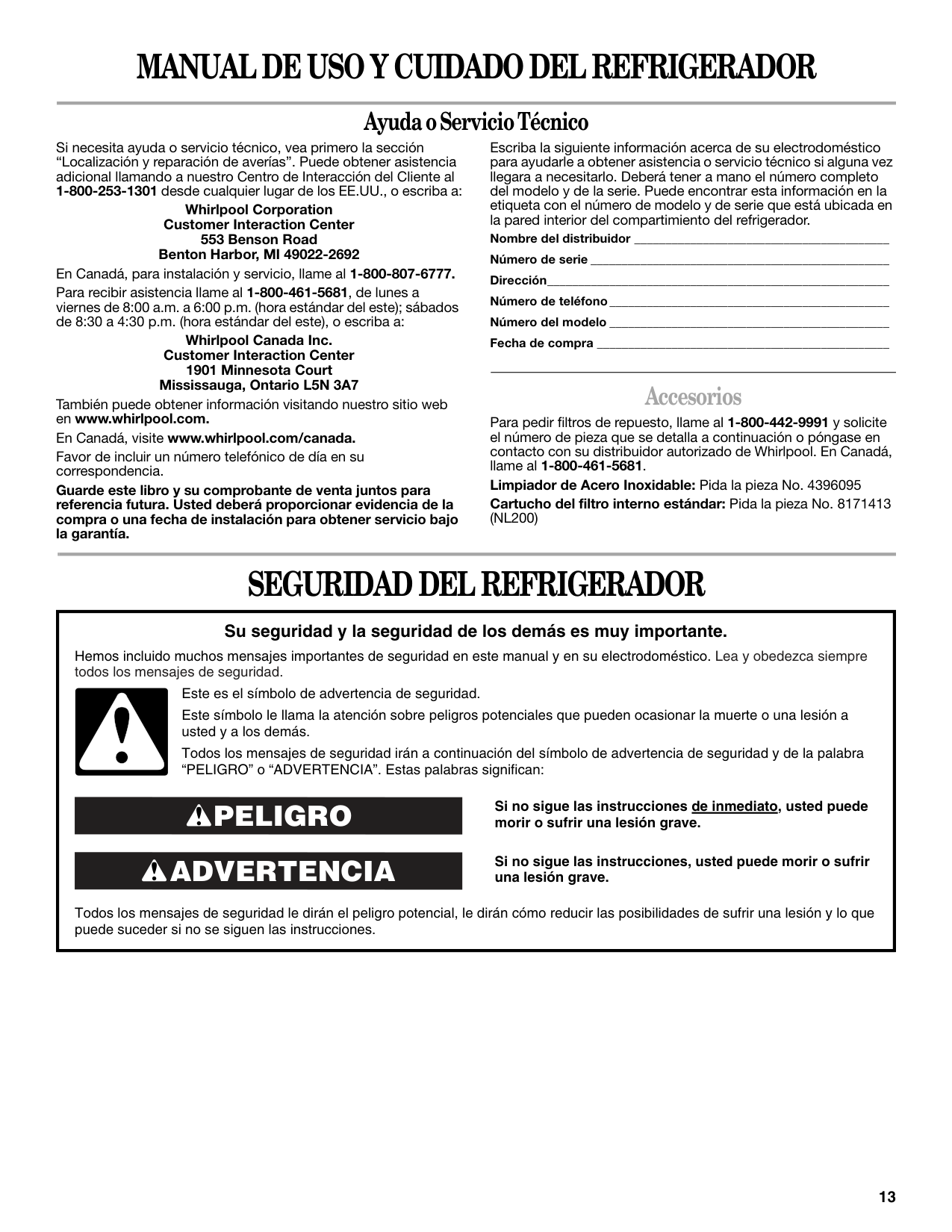 Ayuda o Servicio Técnico Si necesita ayuda o servicio técnico, vea primero la sección “Localización y reparación de averías”. Puede obtener asistencia adicional llamando a nuestro Centro de Interacción del Cliente al 1-800-253-1301 desde cualquier lugar de los EE.UU., o escriba a: Whirlpool Corporation Customer Interaction Center 553 Benson Road Benton Harbor, MI 49022-2692 En Canadá, para instalación y servicio, llame al 1-800-807-6777. Para recibir asistencia llame al 1-800-461-5681, de lunes a viernes de 8:00 a.m. a 6:00 p.m. (hora estándar del este); sábados de 8:30 a 4:30 p.m. (hora estándar del este), o escriba a: Whirlpool Canada Inc. Customer Interaction Center 1901 Minnesota Court Mississauga, Ontario L5N 3A7 También puede obtener información visitando nuestro sitio web en www.whirlpool.com. En Canadá, visite www.whirlpool.com/canada. Favor de incluir un número telefónico de día en su correspondencia. Guarde este libro y su comprobante de venta juntos para referencia futura. Usted deberá proporcionar evidencia de la compra o una fecha de instalación para obtener servicio bajo la garantía. Escriba la siguiente información acerca de su electrodoméstico para ayudarle a obtener asistencia o servicio técnico si alguna vez llegara a necesitarlo. Deberá tener a mano el número completo del modelo y de la serie. Puede encontrar esta información en la etiqueta con el número de modelo y de serie que está ubicada en la pared interior del compartimiento del refrigerador. Nombre del distribuidor _________________________________________ Número de serie ________________________________________________ Dirección_______________________________________________________ Número de teléfono_____________________________________________ Número del modelo _____________________________________________ Fecha de compra _______________________________________________ Accesorios Para pedir filtros de repuesto, llame al 1-800-442-9991 y solicite el número de pieza que se detalla a continuación o póngase en contacto con su distribuidor autorizado de Whirlpool. En Canadá, llame al 1-800-461-5681. Limpiador de Acero Inoxidable: Pida la pieza No. 4396095 Cartucho del filtro interno estándar: Pida la pieza No. 8171413(Nl200)
