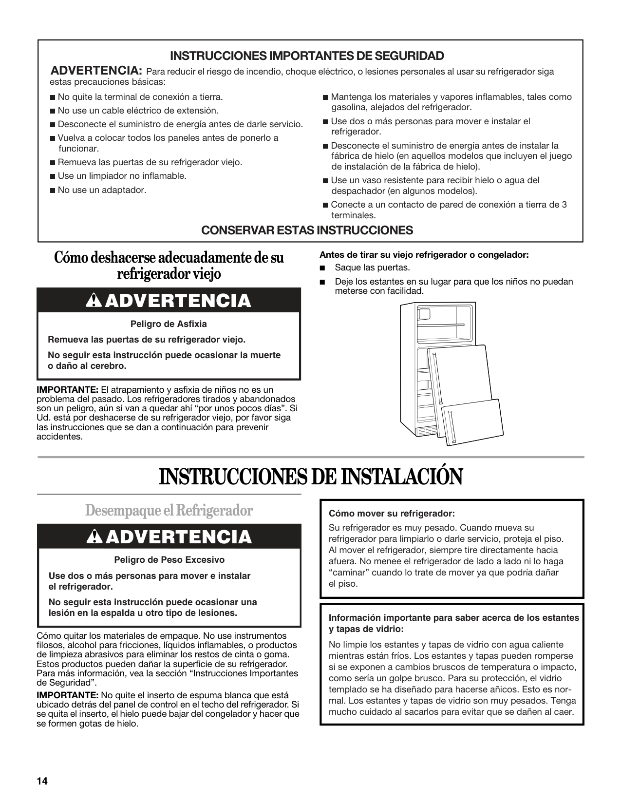 Peligro de Asfixia Remueva las puertas de su refrigerador viejo. No seguir esta instrucción puede ocasionar la muerte o daño al cerebro.Advertencia