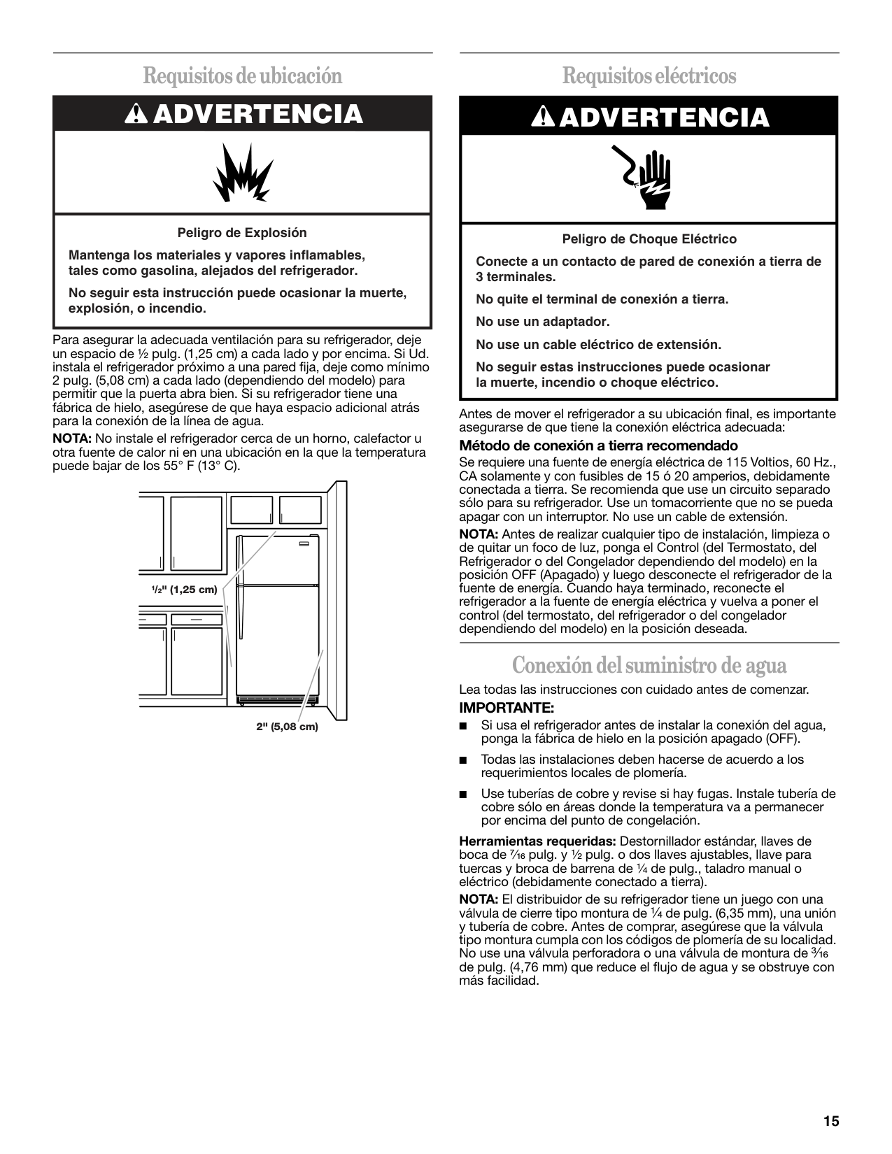 Peligro de Explosión Mantenga los materiales y vapores inflamables, tales como gasolina, alejados del refrigerador. No seguir esta instrucción puede ocasionar la muerte, explosión, o incendio. 1/2" (1,25 cm) 2" (5,08 cm)Advertencia