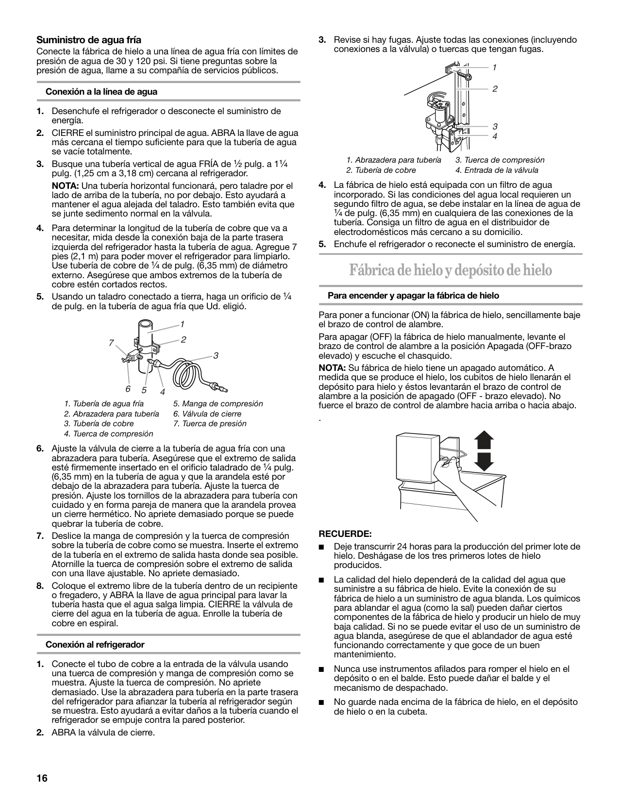 ■ Si usa el refrigerador antes de instalar la conexión del agua, ponga la fábrica de hielo en la posición apagado (OFF). ■ Todas las instalaciones deben hacerse de acuerdo a los requerimientos locales de plomería. ■ Use tuberías de cobre y revise si hay fugas. Instale tubería de cobre sólo en áreas donde la temperatura va a permanecer por encima del punto de congelación. Herramientas requeridas: Destornillador estándar, llaves de boca de ⁷⁄₁₆ pulg. y ¹⁄₂ pulg. o dos llaves ajustables, llave para tuercas y broca de barrena de ¹⁄₄ de pulg., taladro manual o eléctrico (debidamente conectado a tierra). NOTA: El distribuidor de su refrigerador tiene un juego con una válvula de cierre tipo montura de ¹⁄₄ de pulg. (6,35 mm), una unión y tubería de cobre. Antes de comprar, asegúrese que la válvula tipo montura cumpla con los códigos de plomería de su localidad. No use una válvula perforadora o una válvula de montura de ³⁄₁₆ de pulg. (4,76 mm) que reduce el flujo de agua y se obstruye con más facilidad.Advertencia