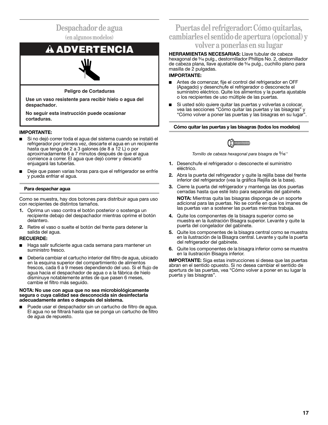 ■ Haga salir suficiente agua cada semana para mantener un suministro fresco. ■ Debería cambiar el cartucho interior del filtro de agua, ubicado en la esquina superior del compartimiento de alimentos frescos, cada 6 a 9 meses dependiendo del uso. Si el flujo de agua hacia el despachador de agua o a la fábrica de hielo disminuye notablemente antes de que pasen 6 meses, cambie el filtro más seguido. NOTA: No use con agua que no sea microbiológicamente segura o cuya calidad sea desconocida sin desinfectarla adecuadamente antes o después del sistema. ■ Puede usar el despachador sin un cartucho de filtro de agua. El agua no se filtrará hasta que se ponga un cartucho de filtro de agua de repuesto. Puertas del refrigerador: Cómo quitarlas, cambiarles el sentido de apertura (opcional) y volver a ponerlas en su lugar HERRAMIENTAS NECESARIAS: Llave tubular de cabeza hexagonal de ⁵⁄₁₆ pulg., destornillador Phillips No. 2, destornillador de cabeza plana, llave ajustable de ⁵⁄₁₆ pulg., cuchillo plano para masilla de 2 pulgadas.Importante: