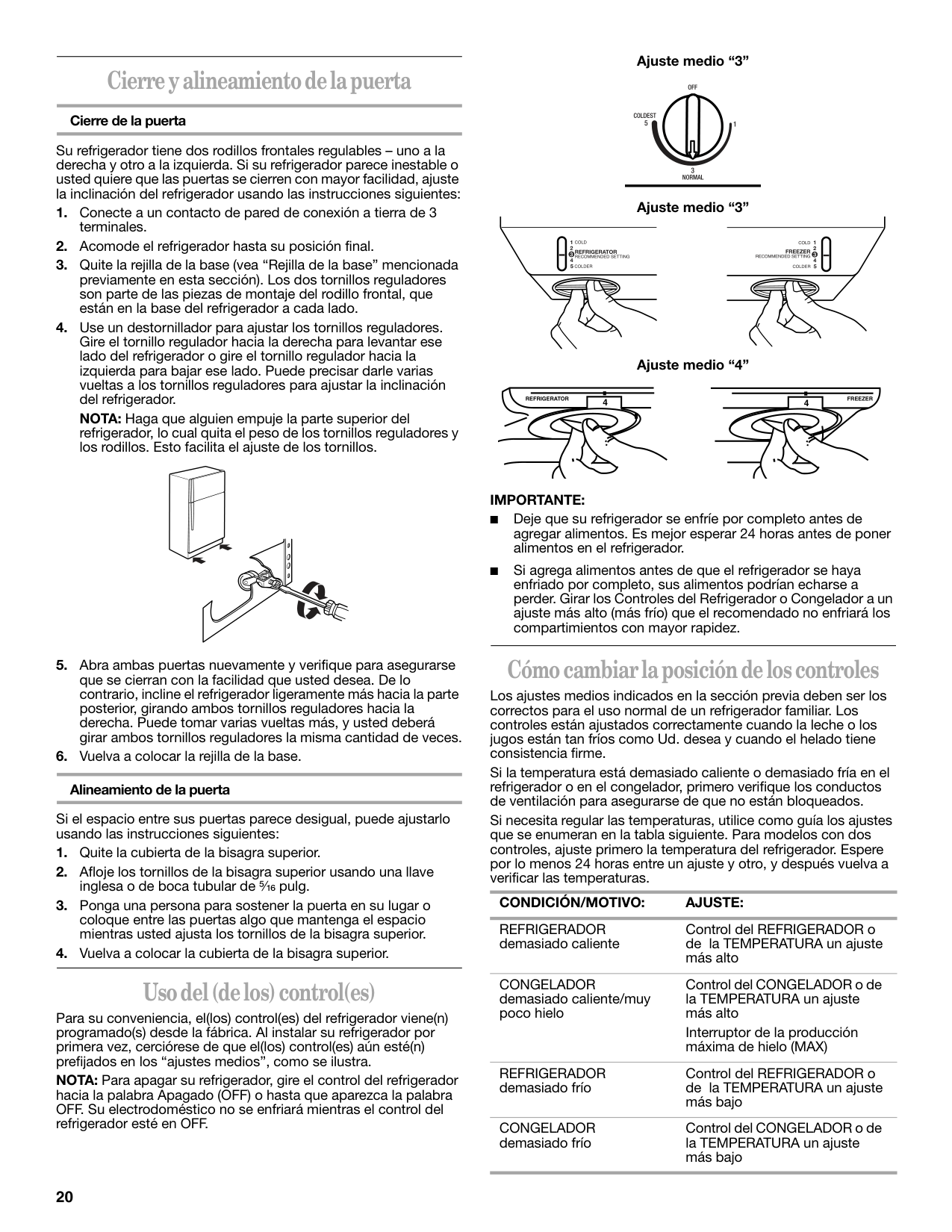 ■ Deje que su refrigerador se enfríe por completo antes de agregar alimentos. Es mejor esperar 24 horas antes de poner alimentos en el refrigerador. ■ Si agrega alimentos antes de que el refrigerador se haya enfriado por completo, sus alimentos podrían echarse a perder. Girar los Controles del Refrigerador o Congelador a un ajuste más alto (más frío) que el recomendado no enfriará los compartimientos con mayor rapidez. Cómo cambiar la posición de los controles Los ajustes medios indicados en la sección previa deben ser los correctos para el uso normal de un refrigerador familiar. Los controles están ajustados correctamente cuando la leche o los jugos están tan fríos como Ud. desea y cuando el helado tiene consistencia firme. Si la temperatura está demasiado caliente o demasiado fría en el refrigerador o en el congelador, primero verifique los conductos de ventilación para asegurarse de que no están bloqueados. Si necesita regular las temperaturas, utilice como guía los ajustes que se enumeran en la tabla siguiente. Para modelos con dos controles, ajuste primero la temperatura del refrigerador. Espere por lo menos 24 horas entre un ajuste y otro, y después vuelva a verificar las temperaturas.Condición/Motivo: