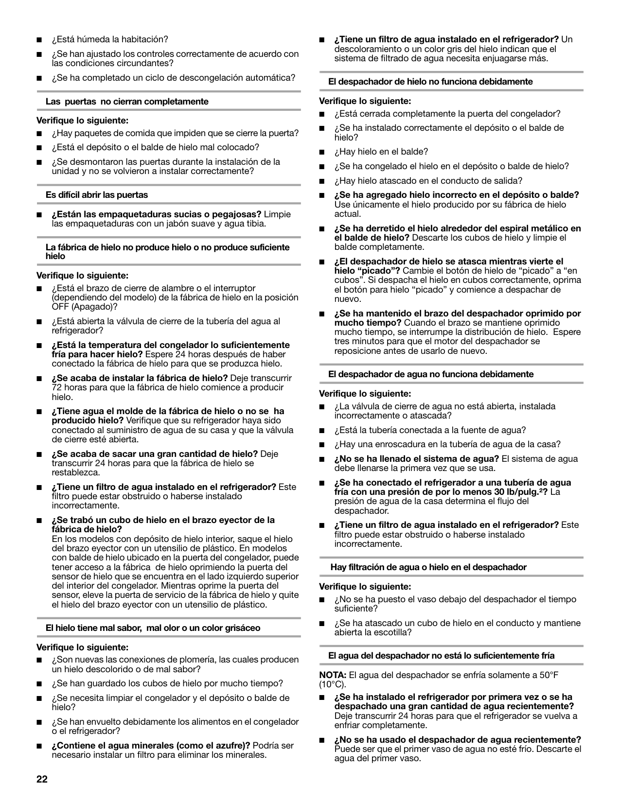 3 322 ■ ¿Está húmeda la habitación? ■ ¿Se han ajustado los controles correctamente de acuerdo con las condiciones circundantes? ■ ¿Se ha completado un ciclo de descongelación automática? Las puertas no cierran completamente Verifique lo siguiente: ■ ¿Hay paquetes de comida que impiden que se cierre la puerta? ■ ¿Está el depósito o el balde de hielo mal colocado? ■ ¿Se desmontaron las puertas durante la instalación de la unidad y no se volvieron a instalar correctamente? Es difícil abrir las puertas ■ ¿Están las empaquetaduras sucias o pegajosas? Limpie las empaquetaduras con un jabón suave y agua tibia. La fábrica de hielo no produce hielo o no produce suficiente hielo Verifique lo siguiente: ■ ¿Está el brazo de cierre de alambre o el interruptor (dependiendo del modelo) de la fábrica de hielo en la posición OFF (Apagado)? ■ ¿Está abierta la válvula de cierre de la tubería del agua al refrigerador? ■ ¿Está la temperatura del congelador lo suficientemente fría para hacer hielo? Espere 24 horas después de haber conectado la fábrica de hielo para que se produzca hielo. ■ ¿Se acaba de instalar la fábrica de hielo? Deje transcurrir 72 horas para que la fábrica de hielo comience a producir hielo. ■ ¿Tiene agua el molde de la fábrica de hielo o no se ha producido hielo? Verifique que su refrigerador haya sido conectado al suministro de agua de su casa y que la válvula de cierre esté abierta. ■ ¿Se acaba de sacar una gran cantidad de hielo? Deje transcurrir 24 horas para que la fábrica de hielo se restablezca. ■ ¿Tiene un filtro de agua instalado en el refrigerador? Este filtro puede estar obstruido o haberse instalado incorrectamente. ■ ¿Se trabó un cubo de hielo en el brazo eyector de la fábrica de hielo? En los modelos con depósito de hielo interior, saque el hielo del brazo eyector con un utensilio de plástico. En modelos con balde de hielo ubicado en la puerta del congelador, puede tener acceso a la fábrica de hielo oprimiendo la puerta del sensor de hielo que se encuentra en el lado izquierdo superior del interior del congelador. Mientras oprime la puerta del sensor, eleve la puerta de servicio de la fábrica de hielo y quite el hielo del brazo eyector con un utensilio de plástico. El hielo tiene mal sabor, mal olor o un color grisáceo Verifique lo siguiente: ■ ¿Son nuevas las conexiones de plomería, las cuales producen un hielo descolorido o de mal sabor? ■ ¿Se han guardado los cubos de hielo por mucho tiempo? ■ ¿Se necesita limpiar el congelador y el depósito o balde de hielo? ■ ¿Se han envuelto debidamente los alimentos en el congelador o el refrigerador? ■ ¿Contiene el agua minerales (como el azufre)? Podría ser necesario instalar un filtro para eliminar los minerales. ■ ¿Tiene un filtro de agua instalado en el refrigerador? Un descoloramiento o un color gris del hielo indican que el sistema de filtrado de agua necesita enjuagarse más. El despachador de hielo no funciona debidamente Verifique lo siguiente: ■ ¿Está cerrada completamente la puerta del congelador? ■ ¿Se ha instalado correctamente el depósito o el balde de hielo? ■ ¿Hay hielo en el balde? ■ ¿Se ha congelado el hielo en el depósito o balde de hielo? ■ ¿Hay hielo atascado en el conducto de salida? ■ ¿Se ha agregado hielo incorrecto en el depósito o balde? Use únicamente el hielo producido por su fábrica de hielo actual. ■ ¿Se ha derretido el hielo alrededor del espiral metálico en el balde de hielo? Descarte los cubos de hielo y limpie el balde completamente. ■ ¿El despachador de hielo se atasca mientras vierte el hielo “picado”? Cambie el botón de hielo de “picado” a “en cubos”. Si despacha el hielo en cubos correctamente, oprima el botón para hielo “picado” y comience a despachar de nuevo. ■ ¿Se ha mantenido el brazo del despachador oprimido por mucho tiempo? Cuando el brazo se mantiene oprimido mucho tiempo, se interrumpe la distribución de hielo. Espere tres minutos para que el motor del despachador se reposicione antes de usarlo de nuevo. El despachador de agua no funciona debidamente Verifique lo siguiente: ■ ¿La válvula de cierre de agua no está abierta, instalada incorrectamente o atascada? ■ ¿Está la tubería conectada a la fuente de agua? ■ ¿Hay una enroscadura en la tubería de agua de la casa? ■ ¿No se ha llenado el sistema de agua? El sistema de agua debe llenarse la primera vez que se usa. ■ ¿Se ha conectado el refrigerador a una tubería de agua fría con una presión de por lo menos 30 lb/pulg.²? La presión de agua de la casa determina el flujo del despachador. ■ ¿Tiene un filtro de agua instalado en el refrigerador? Este filtro puede estar obstruido o haberse instalado incorrectamente. Hay filtración de agua o hielo en el despachador Verifique lo siguiente: ■ ¿No se ha puesto el vaso debajo del despachador el tiempo suficiente? ■ ¿Se ha atascado un cubo de hielo en el conducto y mantiene abierta la escotilla? El agua del despachador no está lo suficientemente fría NOTA: El agua del despachador se enfría solamente a 50°F