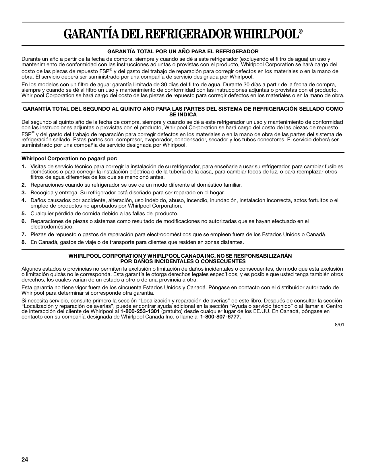 Algunos estados o provincias no permiten la exclusión o limitación de daños incidentales o consecuentes, de modo que esta exclusión o limitación quizás no le corresponda. Esta garantía le otorga derechos legales específicos, y es posible que usted tenga también otros derechos, los cuales varían de un estado a otro o de una provincia a otra. Esta garantía no tiene vigor fuera de los cincuenta Estados Unidos y Canadá. Póngase en contacto con el distribuidor autorizado de Whirlpool para determinar si corresponde otra garantía. Si necesita servicio, consulte primero la sección “Localización y reparación de averías” de este libro. Después de consultar la sección “Localización y reparación de averías”, puede encontrar ayuda adicional en la sección “Ayuda o servicio técnico” o al llamar al Centro de interacción del cliente de Whirlpool al 1-800-253-1301 (gratuito) desde cualquier lugar de los EE.UU. En Canadá, póngase en contacto con su compañía designada de Whirlpool Canada Inc. o llame al 1-800-807-6777. 8/0125