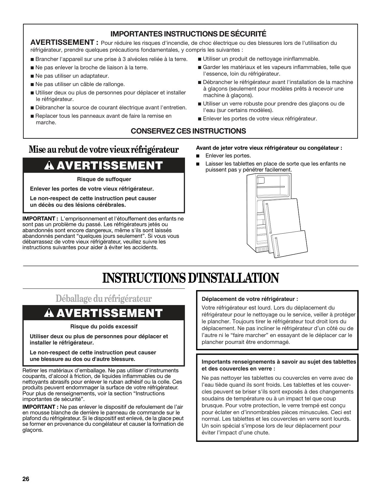 Risque de suffoquer Enlever les portes de votre vieux réfrigérateur. Le non-respect de cette instruction peut causer un décès ou des lésions cérébrales.Avertissement