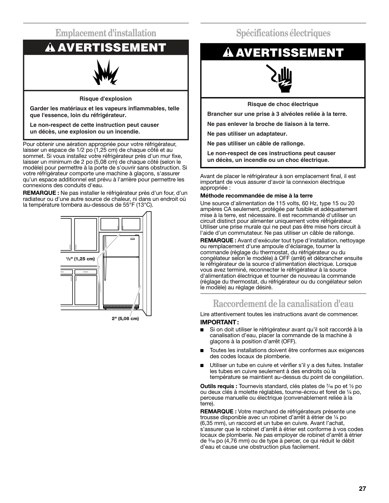 Risque du poids excessif Utiliser deux ou plus de personnes pour déplacer et installer le réfrigérateur. Le non-respect de cette instruction peut causer une blessure au dos ou d'autre blessure. Déplacement de votre réfrigérateur : Votre réfrigérateur est lourd. Lors du déplacement du réfrigérateur pour le nettoyage ou le service, veiller à protéger l le plancher. Toujours tirer le réfrigérateur tout droit lors du déplacement. Ne pas incliner le réfrigérateur d’un côté ou de l’autre ni le “faire marcher” en essayant de le déplacer car le plancher pourrait être endommagé. Importants renseignements à savoir au sujet des tablettes et des couvercles en verre : Ne pas nettoyer les tablettes ou couvercles en verre avec de l’eau tiède quand ils sont froids. Les tablettes et les couver- cles peuvent se briser s'ils sont exposés à des changements soudains de température ou à un impact tel que coup brusque. Pour votre protection, le verre trempé est conçu pour éclater en d’innombrables pièces minuscules. Ceci est normal. Les tablettes et les couvercles en verre sont lourds. Un soin spécial s’impose lors de leur déplacement pour éviter l’impact d’une chute.27 Emplacement d'installation Pour obtenir une aération appropriée pour votre réfrigérateur, laisser un espace de 1/2 po (1,25 cm) de chaque côté et au sommet. Si vous installez votre réfrigérateur près d'un mur fixe, laisser un minimum de 2 po (5,08 cm) de chaque côté (selon le modèle) pour permettre à la porte de s'ouvrir sans obstruction. Si votre réfrigérateur comporte une machine à glaçons, s'assurer qu'un espace additionnel est prévu à l'arrière pour permettre les connexions des conduits d'eau. REMARQUE : Ne pas installer le réfrigérateur près d'un four, d'un radiateur ou d'une autre source de chaleur, ni dans un endroit où la température tombera au-dessous de 55°F (13°C). Spécifications électriques Avant de placer le réfrigérateur à son emplacement final, il est important de vous assurer d'avoir la connexion électrique appropriée : Méthode recommandée de mise à la terre Une source d'alimentation de 115 volts, 60 Hz, type 15 ou 20 ampères CA seulement, protégée par fusible et adéquatement mise à la terre, est nécessaire. Il est recommandé d'utiliser un circuit distinct pour alimenter uniquement votre réfrigérateur. Utiliser une prise murale qui ne peut pas être mise hors circuit à l'aide d'un commutateur. Ne pas utiliser un câble de rallonge. REMARQUE : Avant d'exécuter tout type d'installation, nettoyage ou remplacement d'une ampoule d'éclairage, tourner la commande (réglage du thermostat, du réfrigérateur ou du congélateur selon le modèle) à OFF (arrêt) et débrancher ensuite le réfrigérateur de la source d'alimentation électrique. Lorsque vous avez terminé, reconnecter le réfrigérateur à la source d'alimentation électrique et tourner de nouveau la commande (réglage du thermostat, du réfrigérateur ou du congélateur selon le modèle) au réglage désiré. Raccordement de la canalisation d'eau Lire attentivement toutes les instructions avant de commencer.