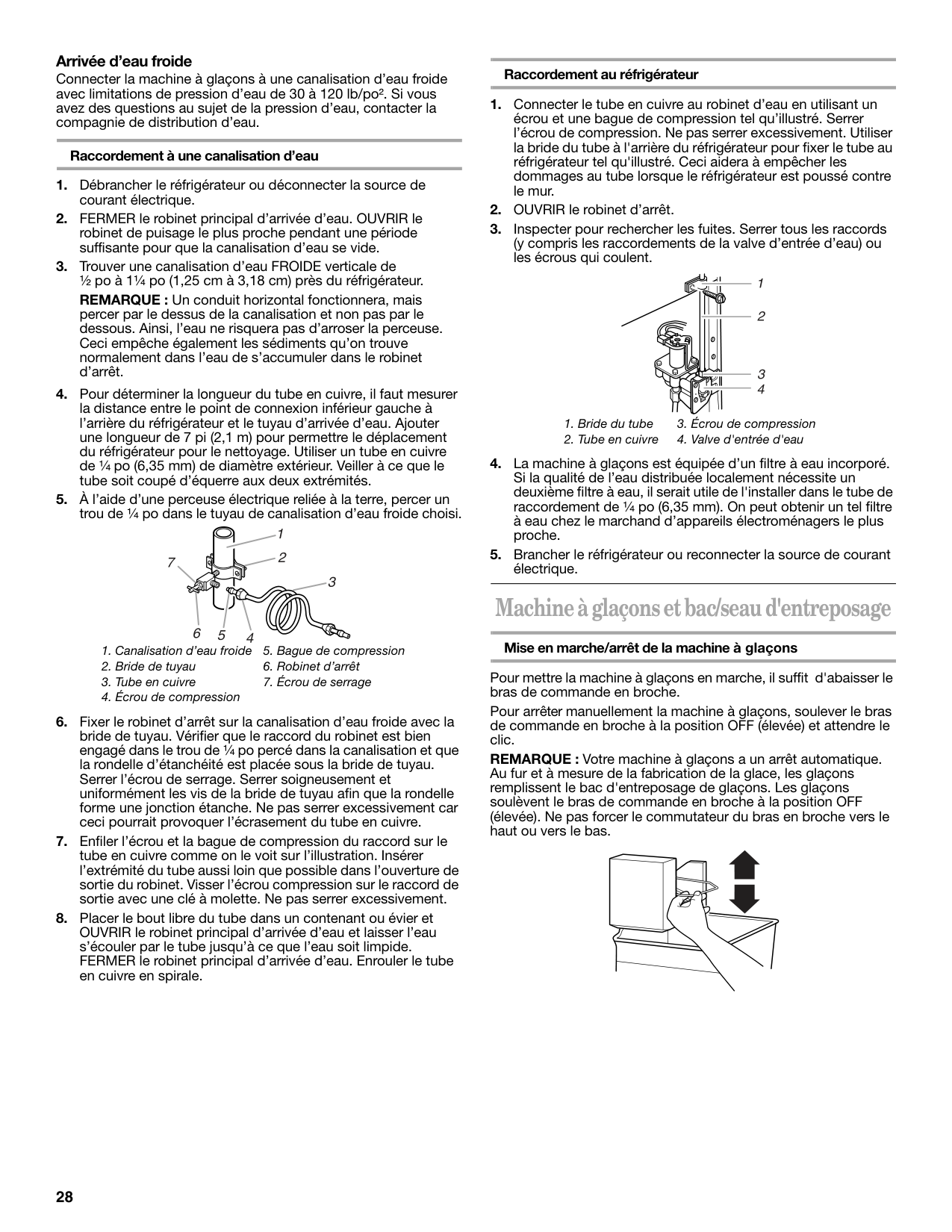 Risque de choc électrique Brancher sur une prise à 3 alvéoles reliée à la terre. Ne pas enlever la broche de liaison à la terre. Ne pas utiliser un adaptateur. Ne pas utiliser un câble de rallonge. Le non-respect de ces instructions peut causer un décès, un incendie ou un choc électrique.28 Arrivée d’eau froide Connecter la machine à glaçons à une canalisation d’eau froide avec limitations de pression d’eau de 30 à 120 lb/po². Si vous avez des questions au sujet de la pression d’eau, contacter la compagnie de distribution d’eau. Raccordement à une canalisation d’eau