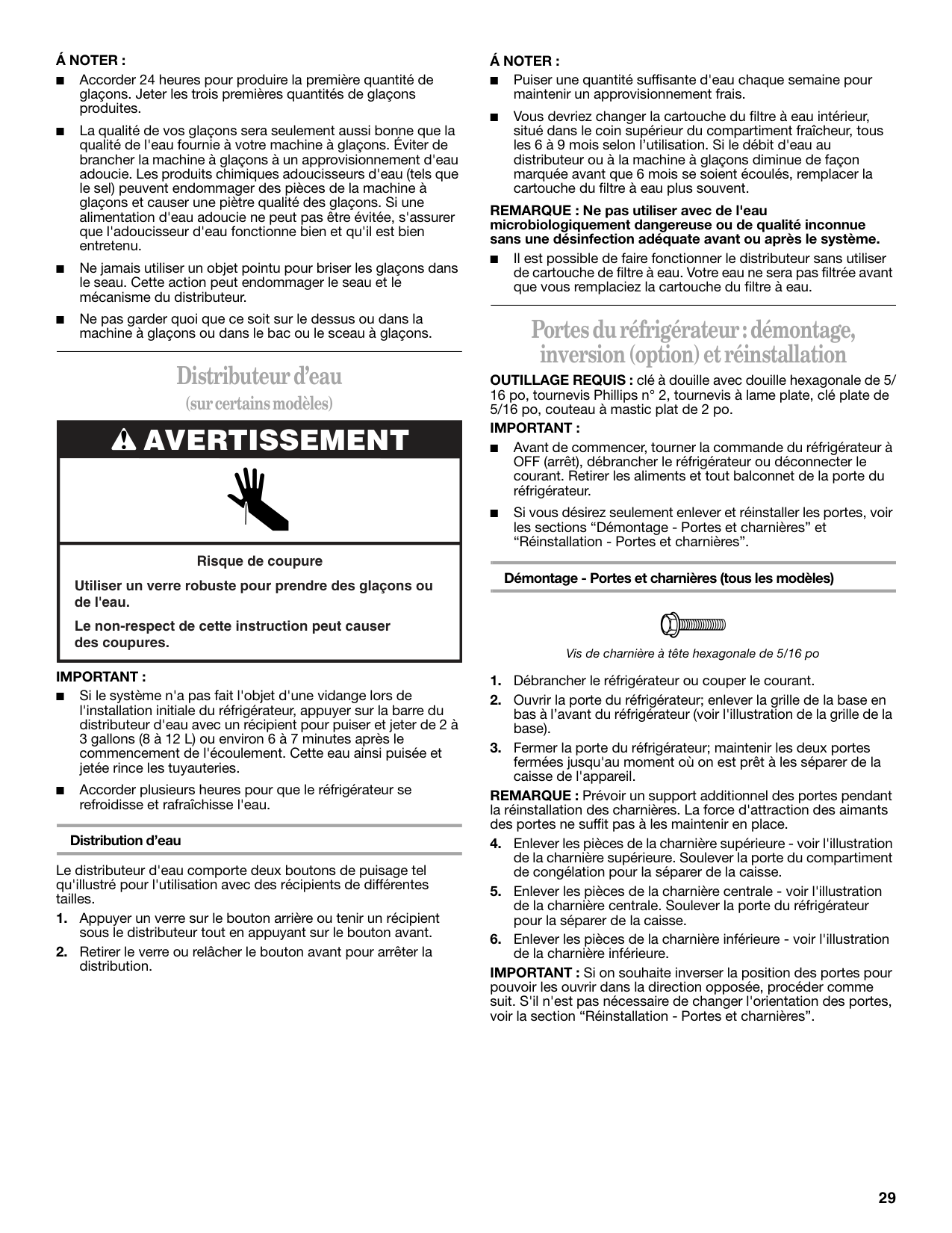 ■ Puiser une quantité suffisante d'eau chaque semaine pour maintenir un approvisionnement frais. ■ Vous devriez changer la cartouche du filtre à eau intérieur, situé dans le coin supérieur du compartiment fraîcheur, tous les 6 à 9 mois selon l’utilisation. Si le débit d'eau au distributeur ou à la machine à glaçons diminue de façon marquée avant que 6 mois se soient écoulés, remplacer la cartouche du filtre à eau plus souvent. REMARQUE : Ne pas utiliser avec de l'eau microbiologiquement dangereuse ou de qualité inconnue sans une désinfection adéquate avant ou après le système. ■ Il est possible de faire fonctionner le distributeur sans utiliser de cartouche de filtre à eau. Votre eau ne sera pas filtrée avant que vous remplaciez la cartouche du filtre à eau. Portes du réfrigérateur : démontage, inversion (option) et réinstallation OUTILLAGE REQUIS : clé à douille avec douille hexagonale de 5/ 16 po, tournevis Phillips n° 2, tournevis à lame plate, clé plate de 5/16 po, couteau à mastic plat de 2 po.Important :