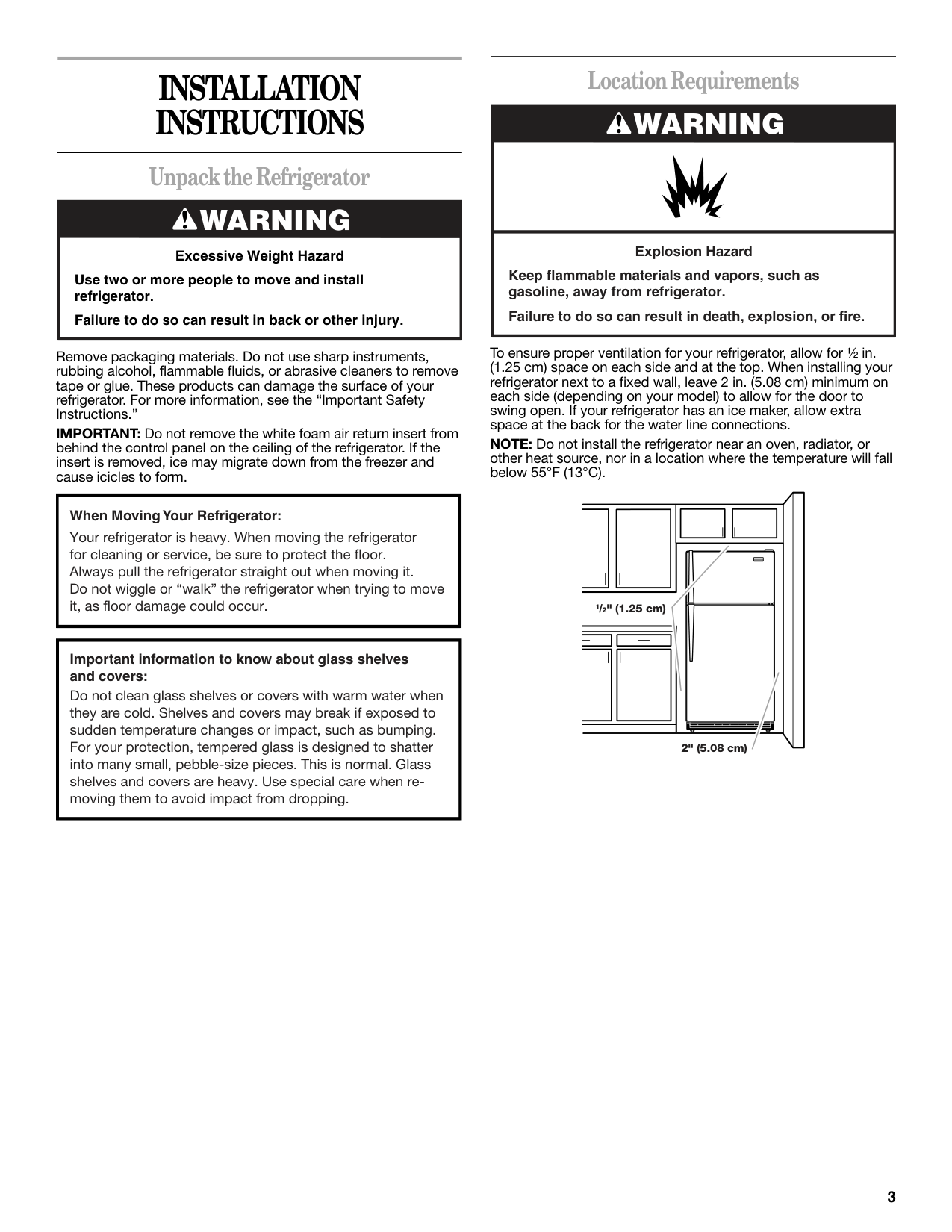 Unpack the Refrigerator Remove packaging materials. Do not use sharp instruments, rubbing alcohol, flammable fluids, or abrasive cleaners to remove tape or glue. These products can damage the surface of your refrigerator. For more information, see the “Important Safety Instructions.” IMPORTANT: Do not remove the white foam air return insert from behind the control panel on the ceiling of the refrigerator. If the insert is removed, ice may migrate down from the freezer and cause icicles to form. Location Requirements To ensure proper ventilation for your refrigerator, allow for ¹⁄₂ in. (1.25 cm) space on each side and at the top. When installing your refrigerator next to a fixed wall, leave 2 in. (5.08 cm) minimum on each side (depending on your model) to allow for the door to swing open. If your refrigerator has an ice maker, allow extra space at the back for the water line connections. NOTE: Do not install the refrigerator near an oven, radiator, or other heat source, nor in a location where the temperature will fall below 55°F (13°C).Warning