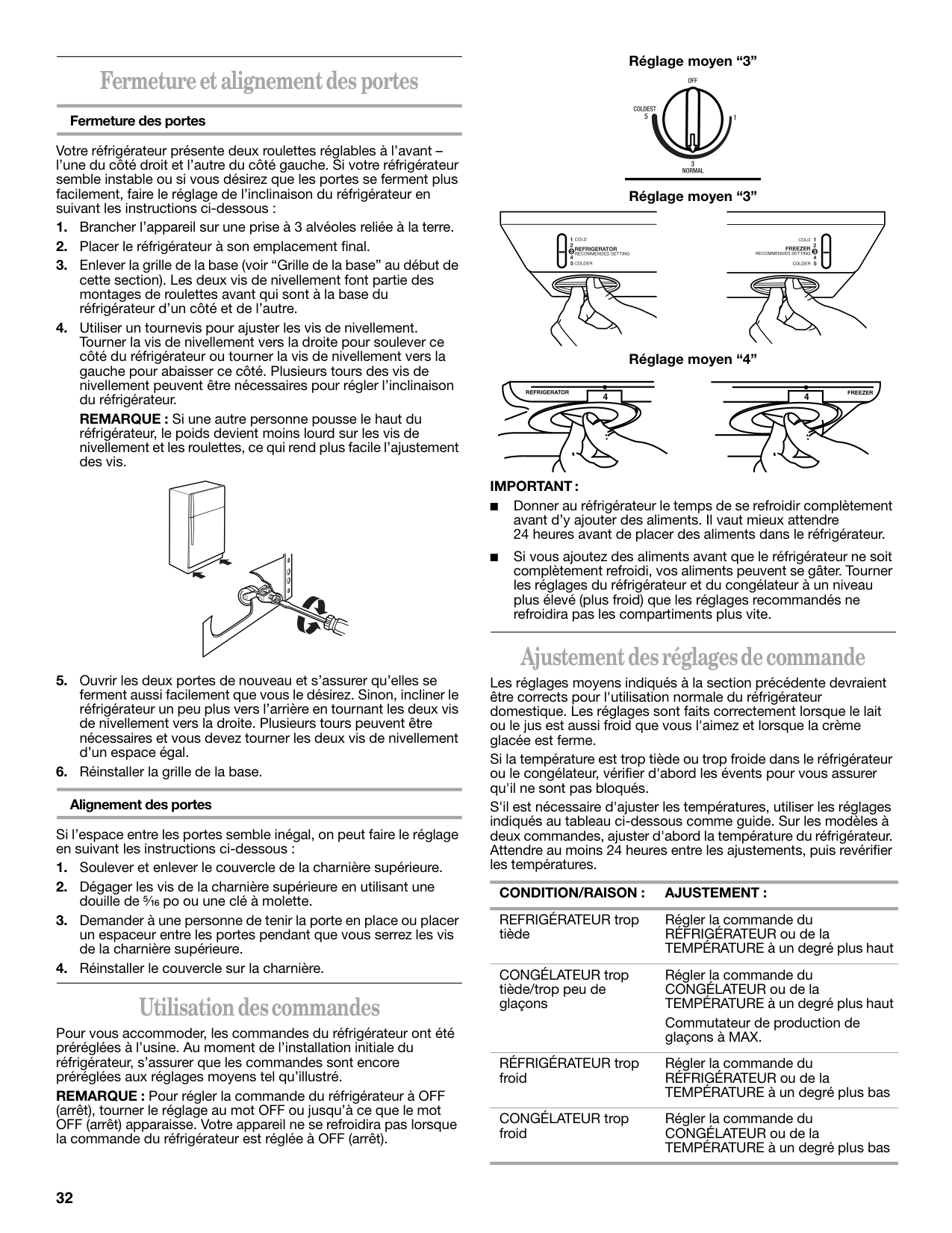 ■ Donner au réfrigérateur le temps de se refroidir complètement avant d’y ajouter des aliments. Il vaut mieux attendre 24 heures avant de placer des aliments dans le réfrigérateur. ■ Si vous ajoutez des aliments avant que le réfrigérateur ne soit complètement refroidi, vos aliments peuvent se gâter. Tourner les réglages du réfrigérateur et du congélateur à un niveau plus élevé (plus froid) que les réglages recommandés ne refroidira pas les compartiments plus vite. Ajustement des réglages de commande Les réglages moyens indiqués à la section précédente devraient être corrects pour l'utilisation normale du réfrigérateur domestique. Les réglages sont faits correctement lorsque le lait ou le jus est aussi froid que vous l'aimez et lorsque la crème glacée est ferme. Si la température est trop tiède ou trop froide dans le réfrigérateur ou le congélateur, vérifier d'abord les évents pour vous assurer qu'il ne sont pas bloqués. S'il est nécessaire d'ajuster les températures, utiliser les réglages indiqués au tableau ci-dessous comme guide. Sur les modèles à deux commandes, ajuster d'abord la température du réfrigérateur. Attendre au moins 24 heures entre les ajustements, puis revérifier les températures.Condition/Raison :