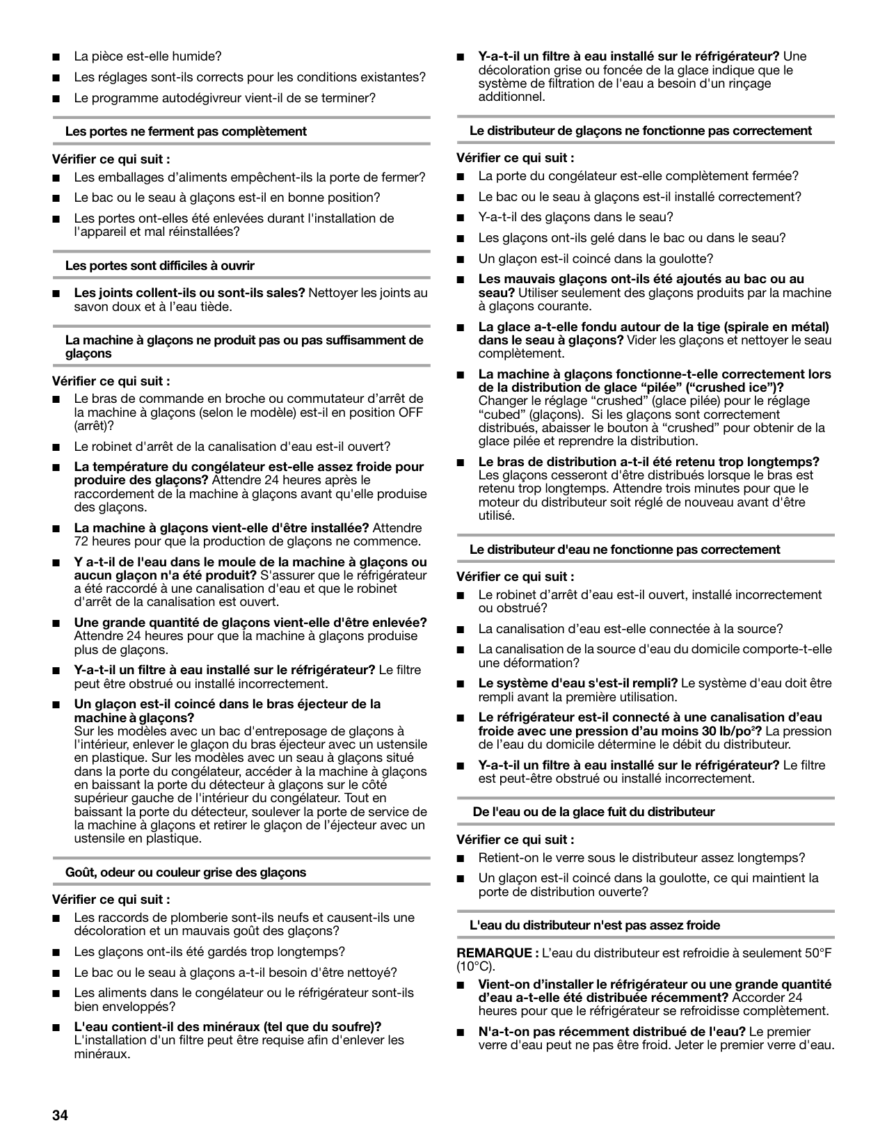 3 334 ■ La pièce est-elle humide? ■ Les réglages sont-ils corrects pour les conditions existantes? ■ Le programme autodégivreur vient-il de se terminer? Les portes ne ferment pas complètement Vérifier ce qui suit : ■ Les emballages d’aliments empêchent-ils la porte de fermer? ■ Le bac ou le seau à glaçons est-il en bonne position? ■ Les portes ont-elles été enlevées durant l'installation de l'appareil et mal réinstallées? Les portes sont difficiles à ouvrir ■ Les joints collent-ils ou sont-ils sales? Nettoyer les joints au savon doux et à l’eau tiède. La machine à glaçons ne produit pas ou pas suffisamment de glaçons Vérifier ce qui suit : ■ Le bras de commande en broche ou commutateur d’arrêt de la machine à glaçons (selon le modèle) est-il en position OFF (arrêt)? ■ Le robinet d'arrêt de la canalisation d'eau est-il ouvert? ■ La température du congélateur est-elle assez froide pour produire des glaçons? Attendre 24 heures après le raccordement de la machine à glaçons avant qu'elle produise des glaçons. ■ La machine à glaçons vient-elle d'être installée? Attendre 72 heures pour que la production de glaçons ne commence. ■ Y a-t-il de l'eau dans le moule de la machine à glaçons ou aucun glaçon n'a été produit? S'assurer que le réfrigérateur a été raccordé à une canalisation d'eau et que le robinet d'arrêt de la canalisation est ouvert. ■ Une grande quantité de glaçons vient-elle d'être enlevée? Attendre 24 heures pour que la machine à glaçons produise plus de glaçons. ■ Y-a-t-il un filtre à eau installé sur le réfrigérateur? Le filtre peut être obstrué ou installé incorrectement. ■ Un glaçon est-il coincé dans le bras éjecteur de la machine à glaçons? Sur les modèles avec un bac d'entreposage de glaçons à l'intérieur, enlever le glaçon du bras éjecteur avec un ustensile en plastique. Sur les modèles avec un seau à glaçons situé dans la porte du congélateur, accéder à la machine à glaçons en baissant la porte du détecteur à glaçons sur le côté supérieur gauche de l'intérieur du congélateur. Tout en baissant la porte du détecteur, soulever la porte de service de la machine à glaçons et retirer le glaçon de l’éjecteur avec un ustensile en plastique. Goût, odeur ou couleur grise des glaçons Vérifier ce qui suit : ■ Les raccords de plomberie sont-ils neufs et causent-ils une décoloration et un mauvais goût des glaçons? ■ Les glaçons ont-ils été gardés trop longtemps? ■ Le bac ou le seau à glaçons a-t-il besoin d'être nettoyé? ■ Les aliments dans le congélateur ou le réfrigérateur sont-ils bien enveloppés? ■ L'eau contient-il des minéraux (tel que du soufre)? L'installation d'un filtre peut être requise afin d'enlever les minéraux. ■ Y-a-t-il un filtre à eau installé sur le réfrigérateur? Une décoloration grise ou foncée de la glace indique que le système de filtration de l'eau a besoin d'un rinçage additionnel. Le distributeur de glaçons ne fonctionne pas correctement Vérifier ce qui suit : ■ La porte du congélateur est-elle complètement fermée? ■ Le bac ou le seau à glaçons est-il installé correctement? ■ Y-a-t-il des glaçons dans le seau? ■ Les glaçons ont-ils gelé dans le bac ou dans le seau? ■ Un glaçon est-il coincé dans la goulotte? ■ Les mauvais glaçons ont-ils été ajoutés au bac ou au seau? Utiliser seulement des glaçons produits par la machine à glaçons courante. ■ La glace a-t-elle fondu autour de la tige (spirale en métal) dans le seau à glaçons? Vider les glaçons et nettoyer le seau complètement. ■ La machine à glaçons fonctionne-t-elle correctement lors de la distribution de glace “pilée” (“crushed ice”)? Changer le réglage “crushed” (glace pilée) pour le réglage “cubed” (glaçons). Si les glaçons sont correctement distribués, abaisser le bouton à “crushed” pour obtenir de la glace pilée et reprendre la distribution. ■ Le bras de distribution a-t-il été retenu trop longtemps? Les glaçons cesseront d'être distribués lorsque le bras est retenu trop longtemps. Attendre trois minutes pour que le moteur du distributeur soit réglé de nouveau avant d'être utilisé. Le distributeur d'eau ne fonctionne pas correctement Vérifier ce qui suit : ■ Le robinet d’arrêt d’eau est-il ouvert, installé incorrectement ou obstrué? ■ La canalisation d’eau est-elle connectée à la source? ■ La canalisation de la source d'eau du domicile comporte-t-elle une déformation? ■ Le système d'eau s'est-il rempli? Le système d'eau doit être rempli avant la première utilisation. ■ Le réfrigérateur est-il connecté à une canalisation d’eau froide avec une pression d’au moins 30 lb/po2? La pression de l’eau du domicile détermine le débit du distributeur. ■ Y-a-t-il un filtre à eau installé sur le réfrigérateur? Le filtre est peut-être obstrué ou installé incorrectement. De l'eau ou de la glace fuit du distributeur Vérifier ce qui suit : ■ Retient-on le verre sous le distributeur assez longtemps? ■ Un glaçon est-il coincé dans la goulotte, ce qui maintient la porte de distribution ouverte? L'eau du distributeur n'est pas assez froide REMARQUE : L’eau du distributeur est refroidie à seulement 50°F