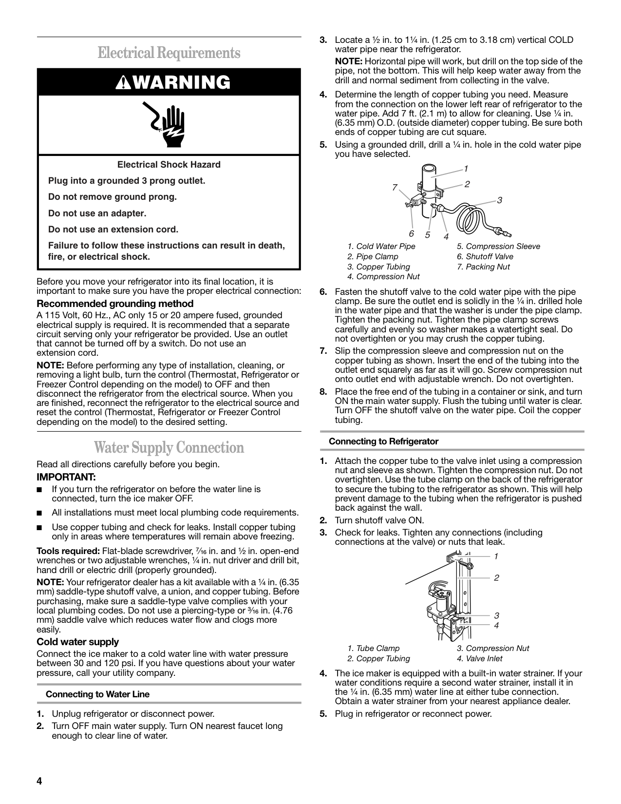 ■ If you turn the refrigerator on before the water line is connected, turn the ice maker OFF. ■ All installations must meet local plumbing code requirements. ■ Use copper tubing and check for leaks. Install copper tubing only in areas where temperatures will remain above freezing. Tools required: Flat-blade screwdriver, ⁷⁄₁₆ in. and ¹⁄₂ in. open-end wrenches or two adjustable wrenches, ¹⁄₄ in. nut driver and drill bit, hand drill or electric drill (properly grounded). NOTE: Your refrigerator dealer has a kit available with a ¹⁄₄ in. (6.35 mm) saddle-type shutoff valve, a union, and copper tubing. Before purchasing, make sure a saddle-type valve complies with your local plumbing codes. Do not use a piercing-type or ³⁄₁₆ in. (4.76 mm) saddle valve which reduces water flow and clogs more easily. Cold water supply Connect the ice maker to a cold water line with water pressure between 30 and 120 psi. If you have questions about your water pressure, call your utility company. Connecting to Water LineWarning