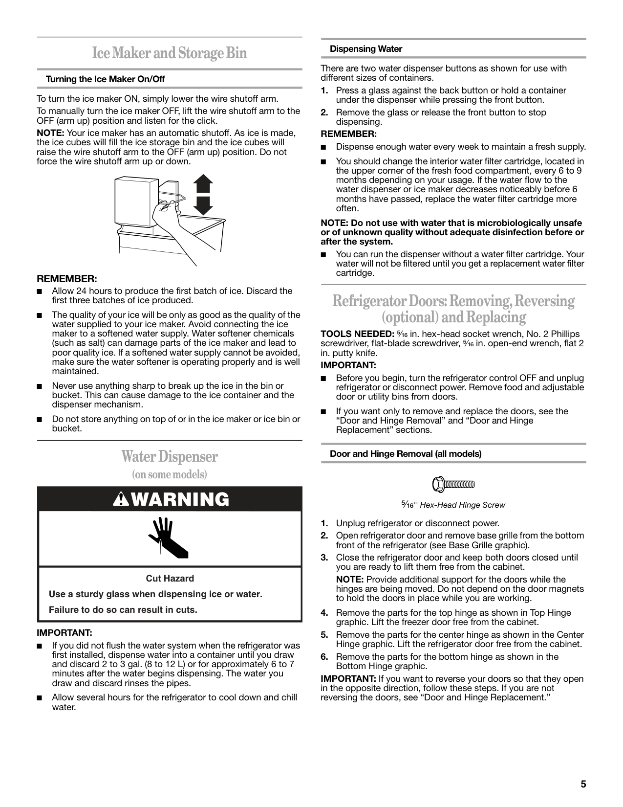 ■ Before you begin, turn the refrigerator control OFF and unplug refrigerator or disconnect power. Remove food and adjustable door or utility bins from doors. ■ If you want only to remove and replace the doors, see the “Door and Hinge Removal” and “Door and Hinge Replacement” sections. Door and Hinge Removal (all models) ⁵⁄₁₆'' Hex-Head Hinge ScrewWarning