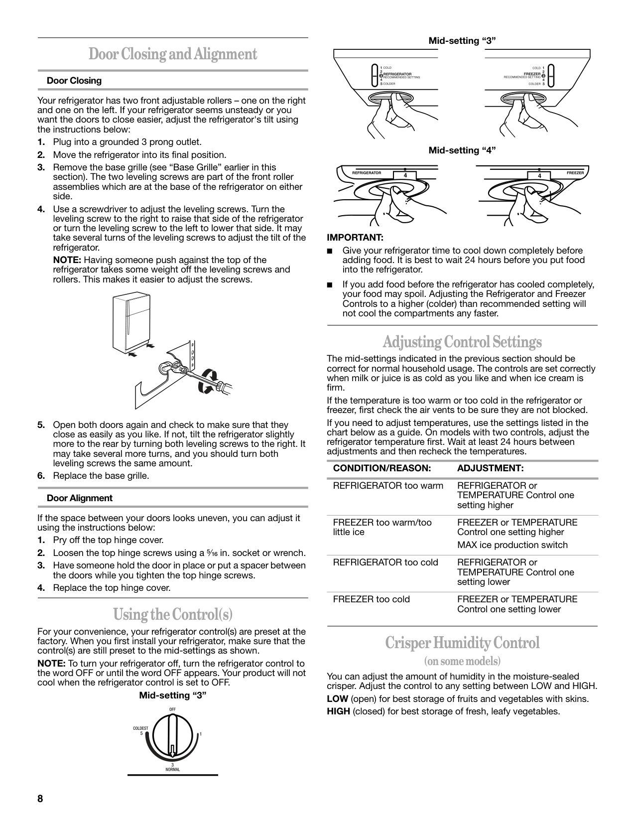 ■ Give your refrigerator time to cool down completely before adding food. It is best to wait 24 hours before you put food into the refrigerator. ■ If you add food before the refrigerator has cooled completely, your food may spoil. Adjusting the Refrigerator and Freezer Controls to a higher (colder) than recommended setting will not cool the compartments any faster. Adjusting Control Settings The mid-settings indicated in the previous section should be correct for normal household usage. The controls are set correctly when milk or juice is as cold as you like and when ice cream is firm. If the temperature is too warm or too cold in the refrigerator or freezer, first check the air vents to be sure they are not blocked. If you need to adjust temperatures, use the settings listed in the chart below as a guide. On models with two controls, adjust the refrigerator temperature first. Wait at least 24 hours between adjustments and then recheck the temperatures. Crisper Humidity Control (on some models) You can adjust the amount of humidity in the moisture-sealed crisper. Adjust the control to any setting between LOW and HIGH. LOW (open) for best storage of fruits and vegetables with skins. HIGH (closed) for best storage of fresh, leafy vegetables.Condition/Reason: