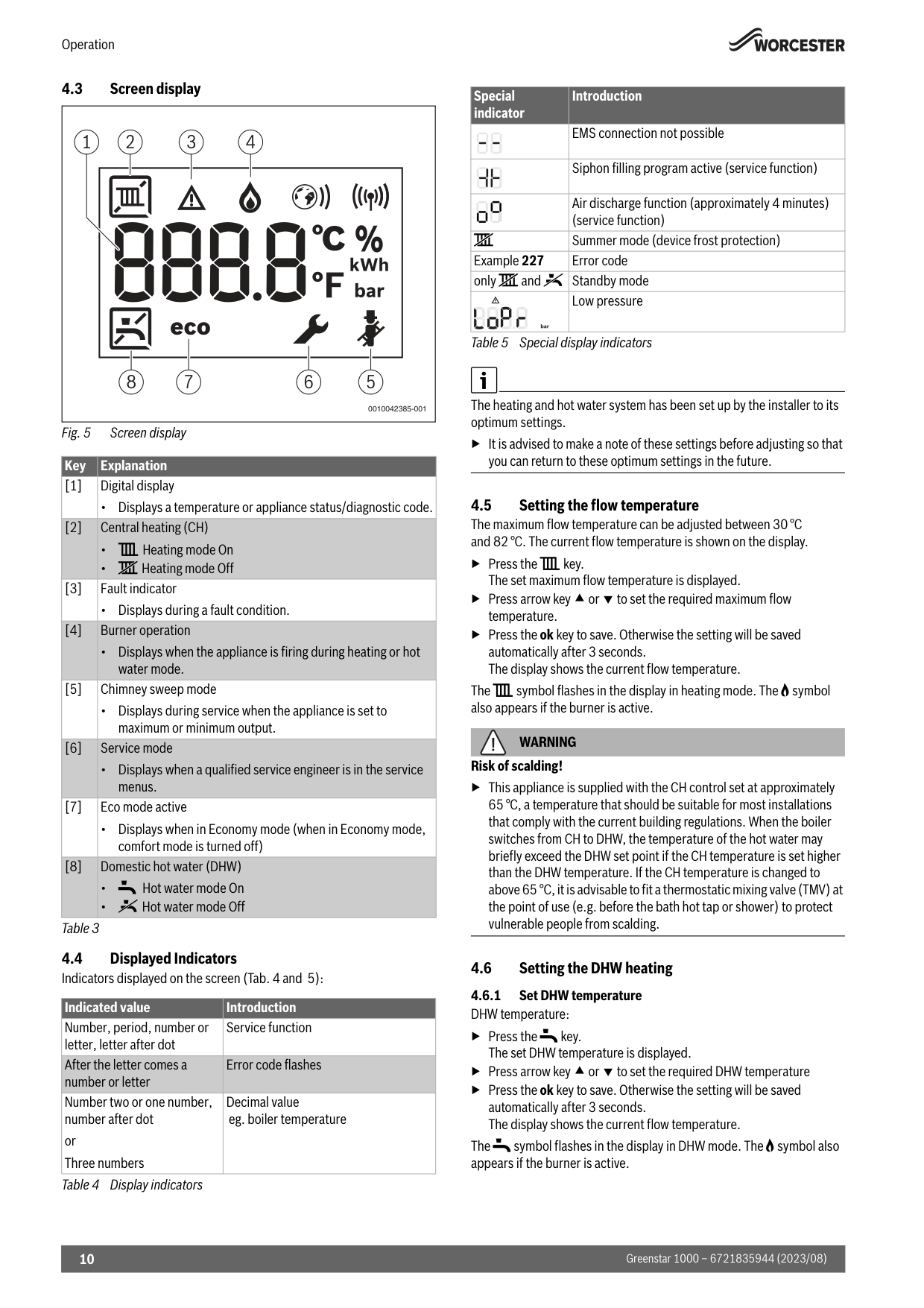 The anti-seizing function is not active when the appliance is switched off. The anti-seizing function prevents the heating pump and the diverter valve from seizing up following long periods of inactivity. 4.2 Control panel overview Fig. 4 [1] Display [2] ( Heating mode on/off, set the maximum flow temperature [3]Operation Greenstar 1000 – 6721835944 (2023/08) 10 4.3 Screen display Fig. 5 Screen display Table 3 4.4 Displayed Indicators Indicators displayed on the screen (Tab. 4 and 5): Table 4 Display indicators Table 5 Special display indicators The heating and hot water system has been set up by the installer to its optimum settings. ▶It is advised to make a note of these settings before adjusting so that you can return to these optimum settings in the future. 4.5 Setting the flow temperature The maximum flow temperature can be adjusted between 30 °C and 82 °C. The current flow temperature is shown on the display. ▶Press the ( key. The set maximum flow temperature is displayed. ▶Press arrow key or to set the required maximum flow temperature. ▶Press the ok key to save. Otherwise the setting will be saved automatically after 3 seconds. The display shows the current flow temperature. The ( symbol flashes in the display in heating mode. The B symbol also appears if the burner is active.