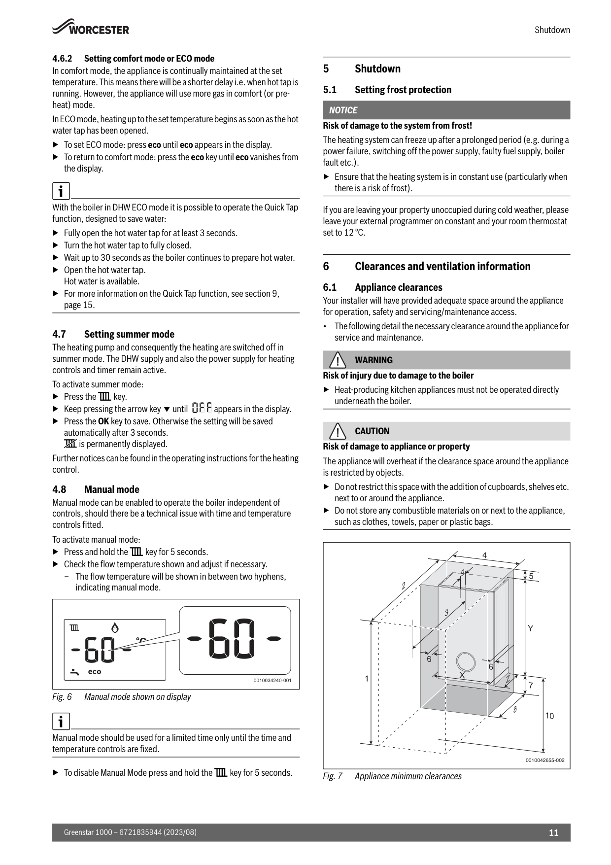 Risk of scalding! ▶This appliance is supplied with the CH control set at approximately 65 °C, a temperature that should be suitable for most installations that comply with the current building regulations. When the boiler switches from CH to DHW, the temperature of the hot water may briefly exceed the DHW set point if the CH temperature is set higher than the DHW temperature. If the CH temperature is changed to above 65 °C, it is advisable to fit a thermostatic mixing valve (TMV) at the point of use (e.g. before the bath hot tap or shower) to protect vulnerable people from scalding. 4.6 Setting the DHW heating 4.6.1 Set DHW temperature DHW temperature: ▶Press the * key. The set DHW temperature is displayed. ▶Press arrow key or to set the required DHW temperature ▶Press the ok key to save. Otherwise the setting will be saved automatically after 3 seconds. The display shows the current flow temperature. The * symbol flashes in the display in DHW mode. The B symbol also appears if the burner is active. Key Explanation [1] Digital display • Displays a temperature or appliance status/diagnostic code. [2] Central heating (CH) • ( Heating mode On • ] Heating mode Off [3] Fault indicator • Displays during a fault condition. [4] Burner operation • Displays when the appliance is firing during heating or hot water mode. [5] Chimney sweep mode • Displays during service when the appliance is set to maximum or minimum output. [6] Service mode • Displays when a qualified service engineer is in the service menus. [7] Eco mode active • Displays when in Economy mode (when in Economy mode, comfort mode is turned off) [8] Domestic hot water (DHW) •Shutdown 11 Greenstar 1000 – 6721835944 (2023/08) 4.6.2 Setting comfort mode or ECO mode In comfort mode, the appliance is continually maintained at the set temperature. This means there will be a shorter delay i.e. when hot tap is running. However, the appliance will use more gas in comfort (or pre- heat) mode. In ECO mode, heating up to the set temperature begins as soon as the hot water tap has been opened. ▶To set ECO mode: press eco until eco appears in the display. ▶To return to comfort mode: press the eco key until eco vanishes from the display. With the boiler in DHW ECO mode it is possible to operate the Quick Tap function, designed to save water: ▶Fully open the hot water tap for at least 3 seconds. ▶Turn the hot water tap to fully closed. ▶Wait up to 30 seconds as the boiler continues to prepare hot water. ▶Open the hot water tap. Hot water is available. ▶For more information on the Quick Tap function, see section 9, page 15. 4.7 Setting summer mode The heating pump and consequently the heating are switched off in summer mode. The DHW supply and also the power supply for heating controls and timer remain active. To activate summer mode: ▶Press the ( key. ▶Keep pressing the arrow key until appears in the display. ▶Press the OK key to save. Otherwise the setting will be saved automatically after 3 seconds. ] is permanently displayed. Further notices can be found in the operating instructions for the heating control. 4.8 Manual mode Manual mode can be enabled to operate the boiler independent of controls, should there be a technical issue with time and temperature controls fitted. To activate manual mode: ▶Press and hold the ( key for 5 seconds. ▶Check the flow temperature shown and adjust if necessary. – The flow temperature will be shown in between two hyphens, indicating manual mode. Fig. 6 Manual mode shown on display Manual mode should be used for a limited time only until the time and temperature controls are fixed. ▶To disable Manual Mode press and hold the ( key for 5 seconds. 5 Shutdown 5.1 Setting frost protection