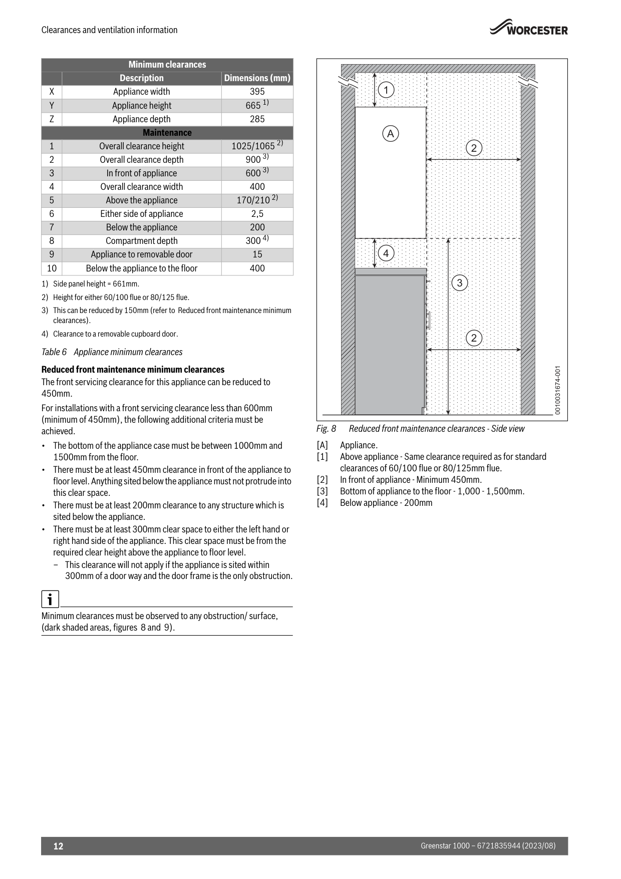 Risk of damage to appliance or property The appliance will overheat if the clearance space around the appliance is restricted by objects. ▶Do not restrict this space with the addition of cupboards, shelves etc. next to or around the appliance. ▶Do not store any combustible materials on or next to the appliance, such as clothes, towels, paper or plastic bags. Fig. 7 Appliance minimum clearances 0010034240-001 0010042655-002Clearances and ventilation information Greenstar 1000 – 6721835944 (2023/08) 12 Table 6 Appliance minimum clearances Reduced front maintenance minimum clearances The front servicing clearance for this appliance can be reduced to 450mm. For installations with a front servicing clearance less than 600mm (minimum of 450mm), the following additional criteria must be achieved. • The bottom of the appliance case must be between 1000mm and 1500mm from the floor. • There must be at least 450mm clearance in front of the appliance to floor level. Anything sited below the appliance must not protrude into this clear space. • There must be at least 200mm clearance to any structure which is sited below the appliance. • There must be at least 300mm clear space to either the left hand or right hand side of the appliance. This clear space must be from the required clear height above the appliance to floor level. – This clearance will not apply if the appliance is sited within 300mm of a door way and the door frame is the only obstruction. Minimum clearances must be observed to any obstruction/ surface, (dark shaded areas, figures 8 and 9). Fig. 8 Reduced front maintenance clearances - Side view