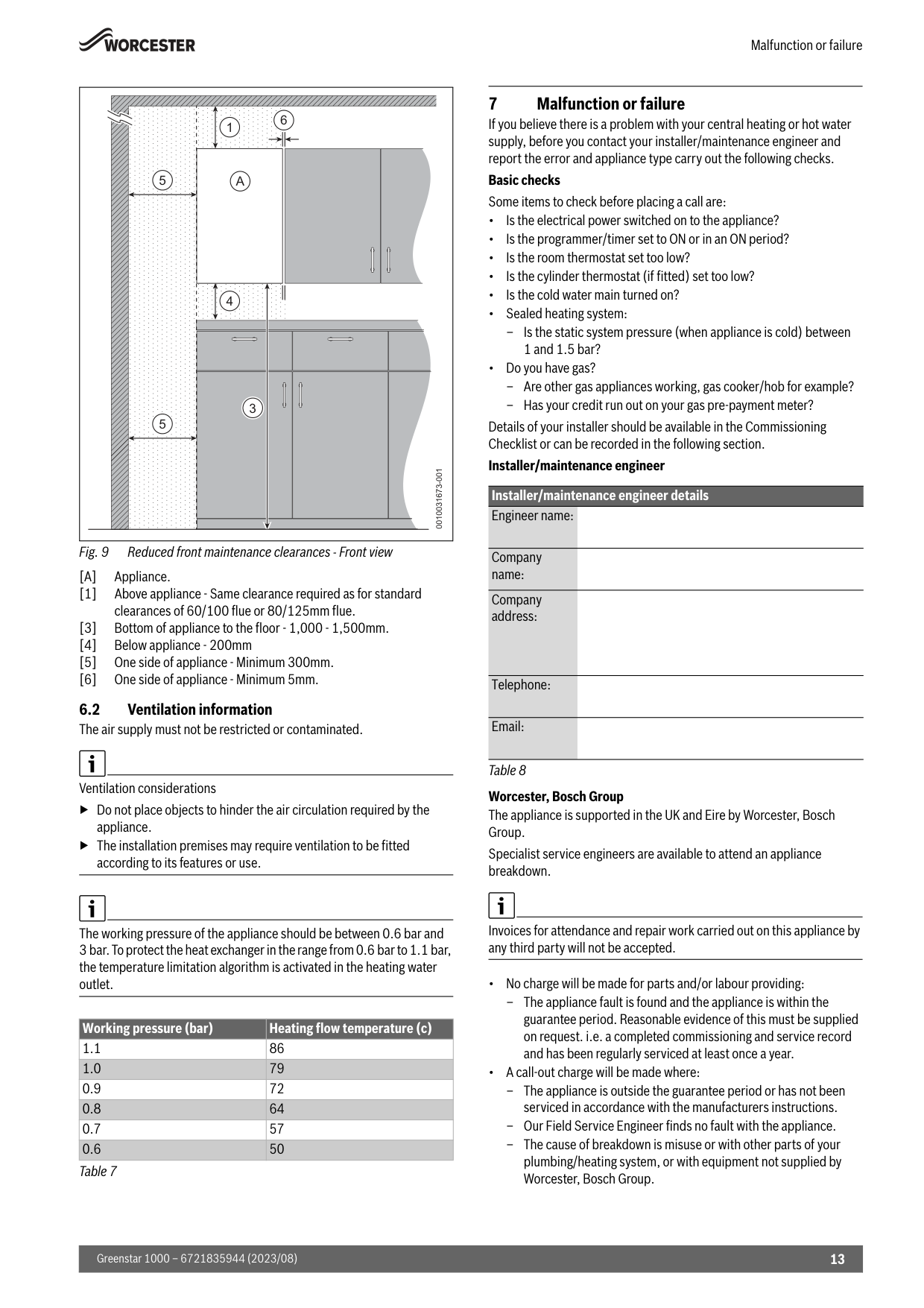 Appliance. [1] Above appliance - Same clearance required as for standard clearances of 60/100 flue or 80/125mm flue. [3] Bottom of appliance to the floor - 1,000 - 1,500mm. [4] Below appliance - 200mm [5] One side of appliance - Minimum 300mm. [6] One side of appliance - Minimum 5mm. 6.2 Ventilation information The air supply must not be restricted or contaminated. Ventilation considerations ▶Do not place objects to hinder the air circulation required by the appliance. ▶The installation premises may require ventilation to be fitted according to its features or use. The working pressure of the appliance should be between 0.6 bar and 3 bar. To protect the heat exchanger in the range from 0.6 bar to 1.1 bar, the temperature limitation algorithm is activated in the heating water outlet. Table 7 7 Malfunction or failure If you believe there is a problem with your central heating or hot water supply, before you contact your installer/maintenance engineer and report the error and appliance type carry out the following checks. Basic checks Some items to check before placing a call are: • Is the electrical power switched on to the appliance? • Is the programmer/timer set to ON or in an ON period? • Is the room thermostat set too low? • Is the cylinder thermostat (if fitted) set too low? • Is the cold water main turned on? • Sealed heating system: – Is the static system pressure (when appliance is cold) between 1 and 1.5 bar? • Do you have gas? – Are other gas appliances working, gas cooker/hob for example? – Has your credit run out on your gas pre-payment meter? Details of your installer should be available in the Commissioning Checklist or can be recorded in the following section. Installer/maintenance engineer Table 8 Worcester, Bosch Group The appliance is supported in the UK and Eire by Worcester, Bosch Group. Specialist service engineers are available to attend an appliance breakdown. Invoices for attendance and repair work carried out on this appliance by any third party will not be accepted. • No charge will be made for parts and/or labour providing: – The appliance fault is found and the appliance is within the guarantee period. Reasonable evidence of this must be supplied on request. i.e. a completed commissioning and service record and has been regularly serviced at least once a year. • A call-out charge will be made where: – The appliance is outside the guarantee period or has not been serviced in accordance with the manufacturers instructions. – Our Field Service Engineer finds no fault with the appliance. – The cause of breakdown is misuse or with other parts of your plumbing/heating system, or with equipment not supplied by Worcester, Bosch Group. Working pressure (bar) Heating flow temperature (c) 1.1 86 1.0 79 0.9 72 0.8 64 0.7 57 0.6 50 0010031673-001 1 6 5 5 4 3A
