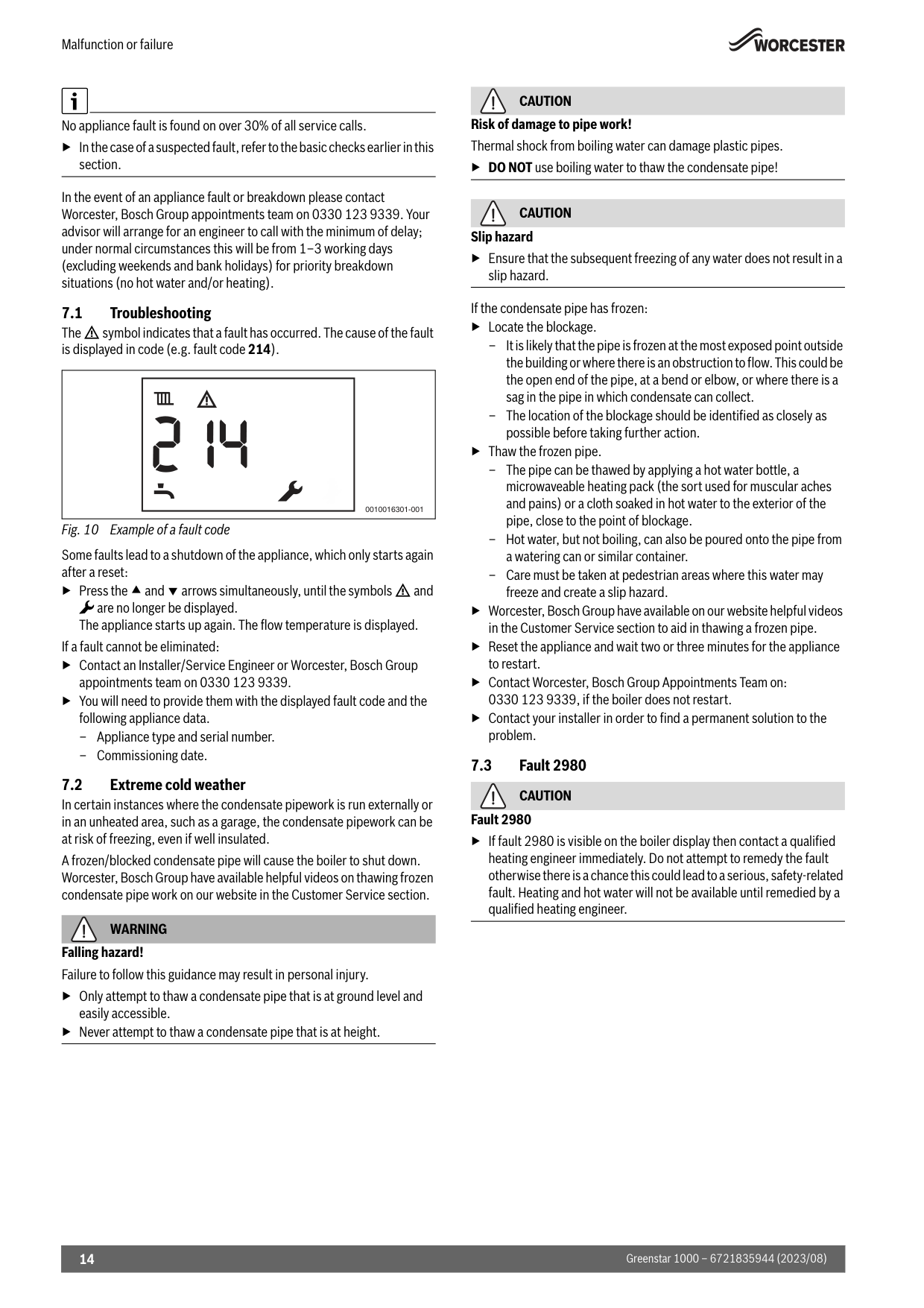 Installer/maintenance engineer details Engineer name: Company name: Company address: Telephone: Email:Malfunction or failure Greenstar 1000 – 6721835944 (2023/08) 14 No appliance fault is found on over 30% of all service calls. ▶In the case of a suspected fault, refer to the basic checks earlier in this section. In the event of an appliance fault or breakdown please contact Worcester, Bosch Group appointments team on 0330 123 9339. Your advisor will arrange for an engineer to call with the minimum of delay; under normal circumstances this will be from 1‒3 working days (excluding weekends and bank holidays) for priority breakdown situations (no hot water and/or heating). 7.1 Troubleshooting The H symbol indicates that a fault has occurred. The cause of the fault is displayed in code (e.g. fault code 214). Fig. 10 Example of a fault code Some faults lead to a shutdown of the appliance, which only starts again after a reset: ▶Press the and arrows simultaneously, until the symbols H and ! are no longer be displayed. The appliance starts up again. The flow temperature is displayed. If a fault cannot be eliminated: ▶Contact an Installer/Service Engineer or Worcester, Bosch Group appointments team on 0330 123 9339. ▶You will need to provide them with the displayed fault code and the following appliance data. – Appliance type and serial number. – Commissioning date. 7.2 Extreme cold weather In certain instances where the condensate pipework is run externally or in an unheated area, such as a garage, the condensate pipework can be at risk of freezing, even if well insulated. A frozen/blocked condensate pipe will cause the boiler to shut down. Worcester, Bosch Group have available helpful videos on thawing frozen condensate pipe work on our website in the Customer Service section.