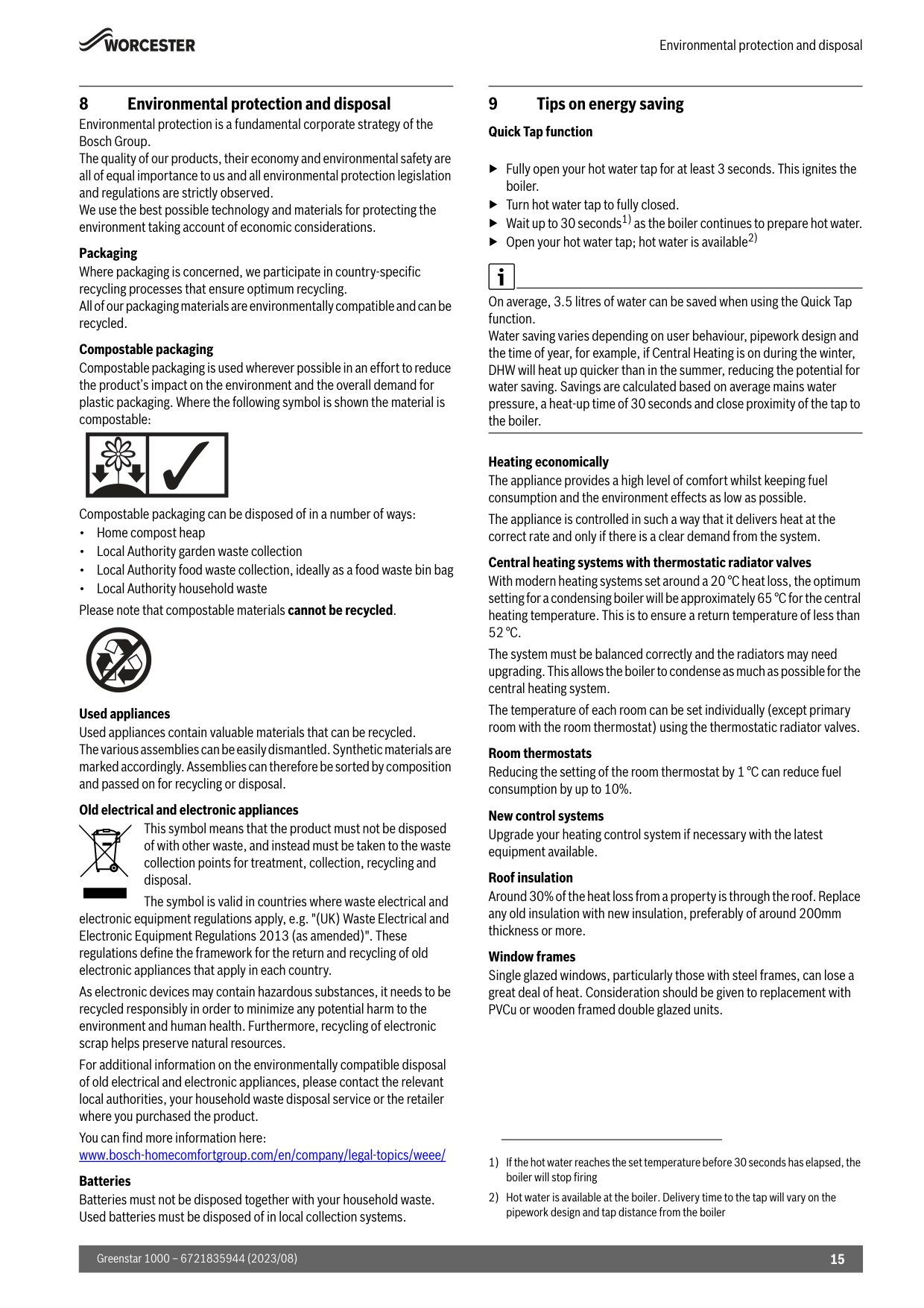 Fault 2980 ▶If fault 2980 is visible on the boiler display then contact a qualified heating engineer immediately. Do not attempt to remedy the fault otherwise there is a chance this could lead to a serious, safety-related fault. Heating and hot water will not be available until remedied by a qualified heating engineer. 0010016301-001Environmental protection and disposal 15 Greenstar 1000 – 6721835944 (2023/08) 8 Environmental protection and disposal Environmental protection is a fundamental corporate strategy of the Bosch Group. The quality of our products, their economy and environmental safety are all of equal importance to us and all environmental protection legislation and regulations are strictly observed. We use the best possible technology and materials for protecting the environment taking account of economic considerations. Packaging Where packaging is concerned, we participate in country-specific recycling processes that ensure optimum recycling. All of our packaging materials are environmentally compatible and can be recycled. Compostable packaging Compostable packaging is used wherever possible in an effort to reduce the product’s impact on the environment and the overall demand for plastic packaging. Where the following symbol is shown the material is compostable: Compostable packaging can be disposed of in a number of ways: • Home compost heap • Local Authority garden waste collection • Local Authority food waste collection, ideally as a food waste bin bag • Local Authority household waste Please note that compostable materials cannot be recycled. Used appliances Used appliances contain valuable materials that can be recycled. The various assemblies can be easily dismantled. Synthetic materials are marked accordingly. Assemblies can therefore be sorted by composition and passed on for recycling or disposal. Old electrical and electronic appliances This symbol means that the product must not be disposed of with other waste, and instead must be taken to the waste collection points for treatment, collection, recycling and disposal. The symbol is valid in countries where waste electrical and electronic equipment regulations apply, e.g. "(UK) Waste Electrical and Electronic Equipment Regulations 2013 (as amended)". These regulations define the framework for the return and recycling of old electronic appliances that apply in each country. As electronic devices may contain hazardous substances, it needs to be recycled responsibly in order to minimize any potential harm to the environment and human health. Furthermore, recycling of electronic scrap helps preserve natural resources. For additional information on the environmentally compatible disposal of old electrical and electronic appliances, please contact the relevant local authorities, your household waste disposal service or the retailer where you purchased the product. You can find more information here: www.bosch-homecomfortgroup.com/en/company/legal-topics/weee/ Batteries Batteries must not be disposed together with your household waste. Used batteries must be disposed of in local collection systems. 9 Tips on energy saving Quick Tap function ▶Fully open your hot water tap for at least 3 seconds. This ignites the boiler. ▶Turn hot water tap to fully closed. ▶Wait up to 30 seconds1) as the boiler continues to prepare hot water. ▶Open your hot water tap; hot water is available2) On average, 3.5 litres of water can be saved when using the Quick Tap function. Water saving varies depending on user behaviour, pipework design and the time of year, for example, if Central Heating is on during the winter, DHW will heat up quicker than in the summer, reducing the potential for water saving. Savings are calculated based on average mains water pressure, a heat-up time of 30 seconds and close proximity of the tap to the boiler. Heating economically The appliance provides a high level of comfort whilst keeping fuel consumption and the environment effects as low as possible. The appliance is controlled in such a way that it delivers heat at the correct rate and only if there is a clear demand from the system. Central heating systems with thermostatic radiator valves With modern heating systems set around a 20 °C heat loss, the optimum setting for a condensing boiler will be approximately 65 °C for the central heating temperature. This is to ensure a return temperature of less than