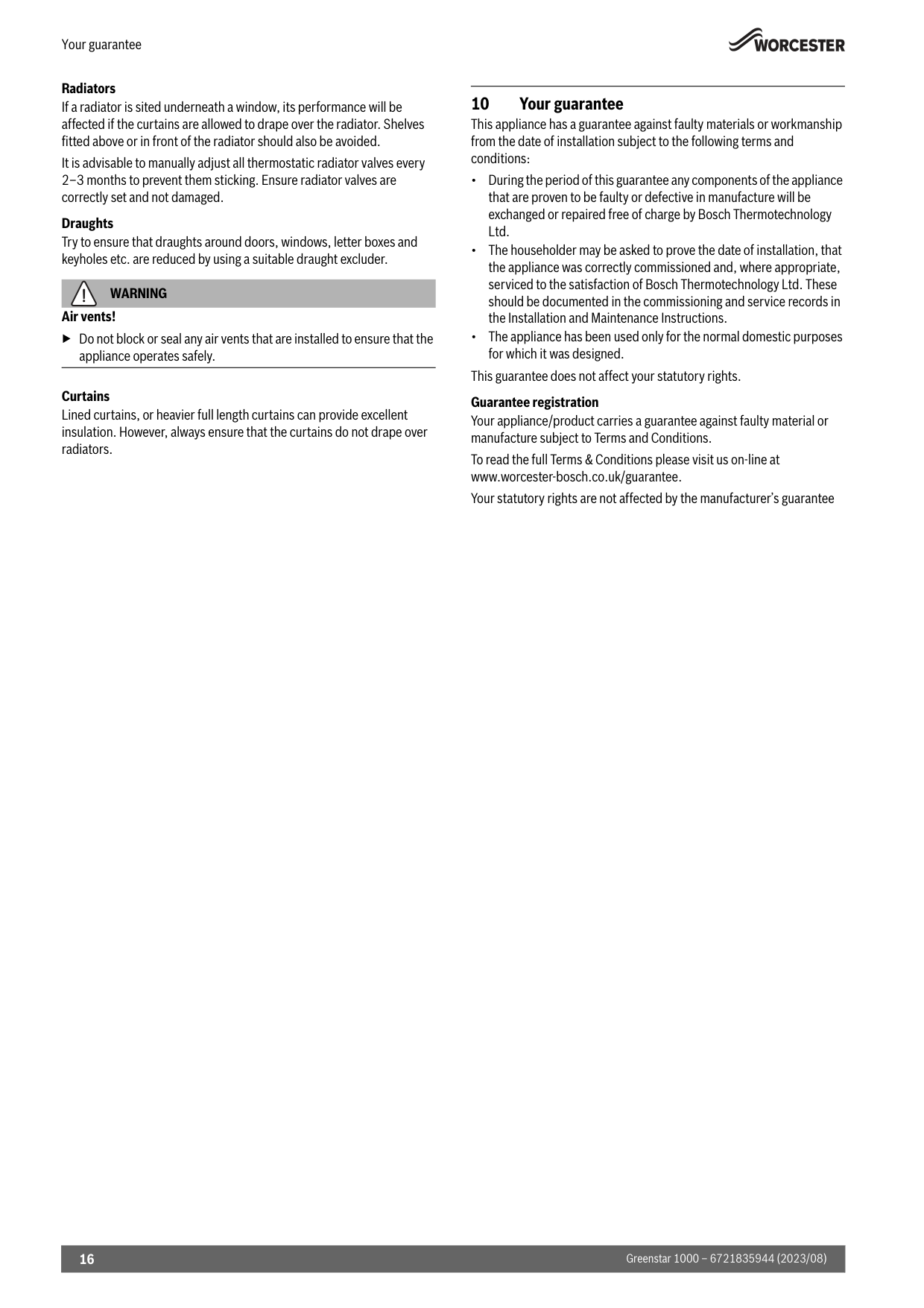 The system must be balanced correctly and the radiators may need upgrading. This allows the boiler to condense as much as possible for the central heating system. The temperature of each room can be set individually (except primary room with the room thermostat) using the thermostatic radiator valves. Room thermostats Reducing the setting of the room thermostat by 1 °C can reduce fuel consumption by up to 10%. New control systems Upgrade your heating control system if necessary with the latest equipment available. Roof insulation Around 30% of the heat loss from a property is through the roof. Replace any old insulation with new insulation, preferably of around 200mm thickness or more. Window frames Single glazed windows, particularly those with steel frames, can lose a great deal of heat. Consideration should be given to replacement with PVCu or wooden framed double glazed units. 1) If the hot water reaches the set temperature before 30 seconds has elapsed, the boiler will stop firing 2) Hot water is available at the boiler. Delivery time to the tap will vary on the pipework design and tap distance from the boilerYour guarantee Greenstar 1000 – 6721835944 (2023/08) 16 Radiators If a radiator is sited underneath a window, its performance will be affected if the curtains are allowed to drape over the radiator. Shelves fitted above or in front of the radiator should also be avoided. It is advisable to manually adjust all thermostatic radiator valves every 2‒3 months to prevent them sticking. Ensure radiator valves are correctly set and not damaged. Draughts Try to ensure that draughts around doors, windows, letter boxes and keyholes etc. are reduced by using a suitable draught excluder.