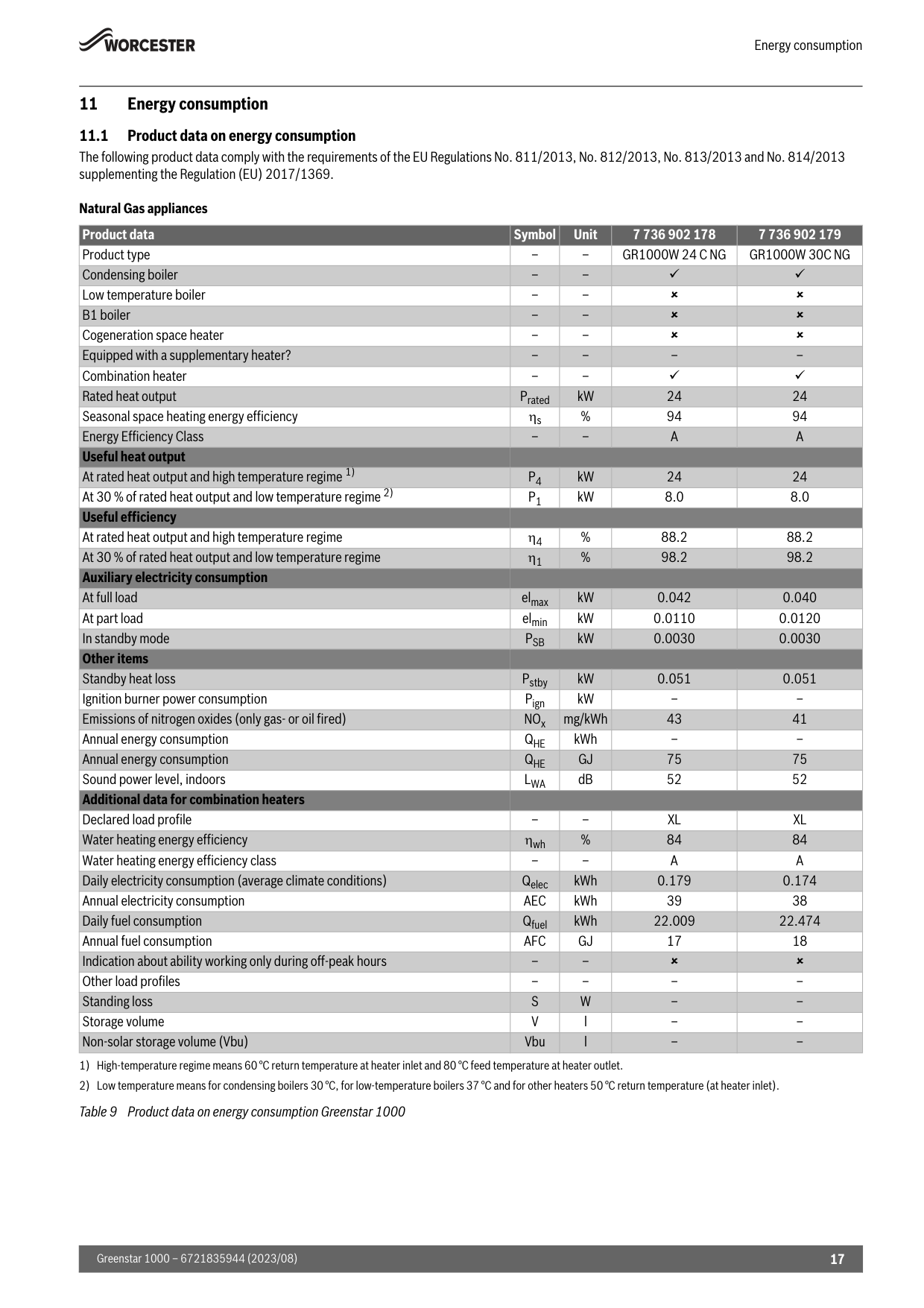 Air vents! ▶Do not block or seal any air vents that are installed to ensure that the appliance operates safely. Curtains Lined curtains, or heavier full length curtains can provide excellent insulation. However, always ensure that the curtains do not drape over radiators. 10 Your guarantee This appliance has a guarantee against faulty materials or workmanship from the date of installation subject to the following terms and conditions: • During the period of this guarantee any components of the appliance that are proven to be faulty or defective in manufacture will be exchanged or repaired free of charge by Bosch Thermotechnology Ltd. • The householder may be asked to prove the date of installation, that the appliance was correctly commissioned and, where appropriate, serviced to the satisfaction of Bosch Thermotechnology Ltd. These should be documented in the commissioning and service records in the Installation and Maintenance Instructions. • The appliance has been used only for the normal domestic purposes for which it was designed. This guarantee does not affect your statutory rights. Guarantee registration Your appliance/product carries a guarantee against faulty material or manufacture subject to Terms and Conditions. To read the full Terms & Conditions please visit us on-line at www.worcester-bosch.co.uk/guarantee. Your statutory rights are not affected by the manufacturer’s guaranteeEnergy consumption 17 Greenstar 1000 – 6721835944 (2023/08) 11 Energy consumption 11.1 Product data on energy consumption The following product data comply with the requirements of the EU Regulations No. 811/2013, No. 812/2013, No. 813/2013 and No. 814/2013 supplementing the Regulation (EU) 2017/1369. Natural Gas appliances Table 9 Product data on energy consumption Greenstar 1000 Product data Symbol Unit 7 736 902 178 7 736 902 179 Product type – –