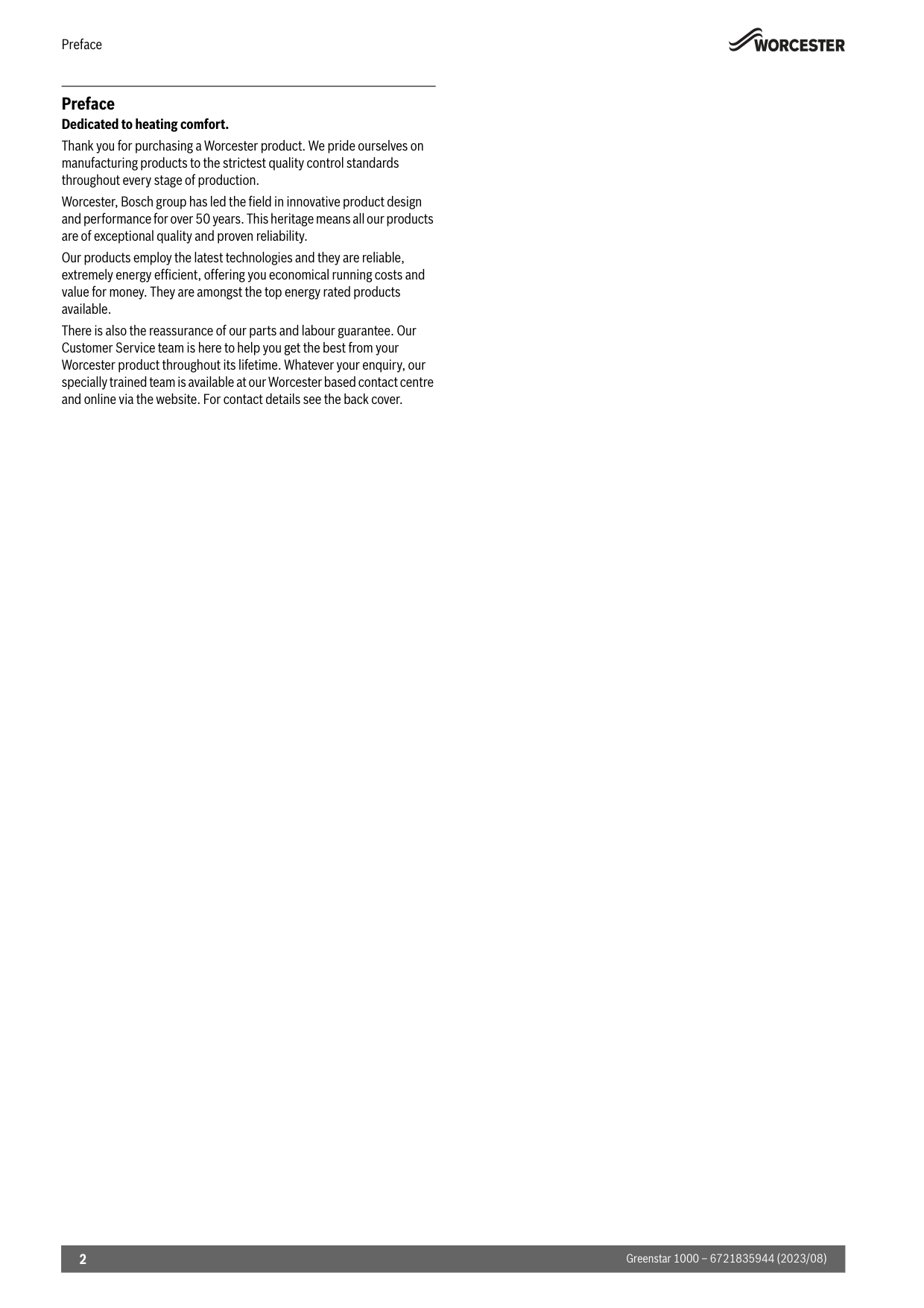 Preface Greenstar 1000 – 6721835944 (2023/08) 2 Preface Dedicated to heating comfort. Thank you for purchasing a Worcester product. We pride ourselves on manufacturing products to the strictest quality control standards throughout every stage of production. Worcester, Bosch group has led the field in innovative product design and performance for over 50 years. This heritage means all our products are of exceptional quality and proven reliability. Our products employ the latest technologies and they are reliable, extremely energy efficient, offering you economical running costs and value for money. They are amongst the top energy rated products available. There is also the reassurance of our parts and labour guarantee. Our Customer Service team is here to help you get the best from your Worcester product throughout its lifetime. Whatever your enquiry, our specially trained team is available at our Worcester based contact centre and online via the website. For contact details see the back cover.
