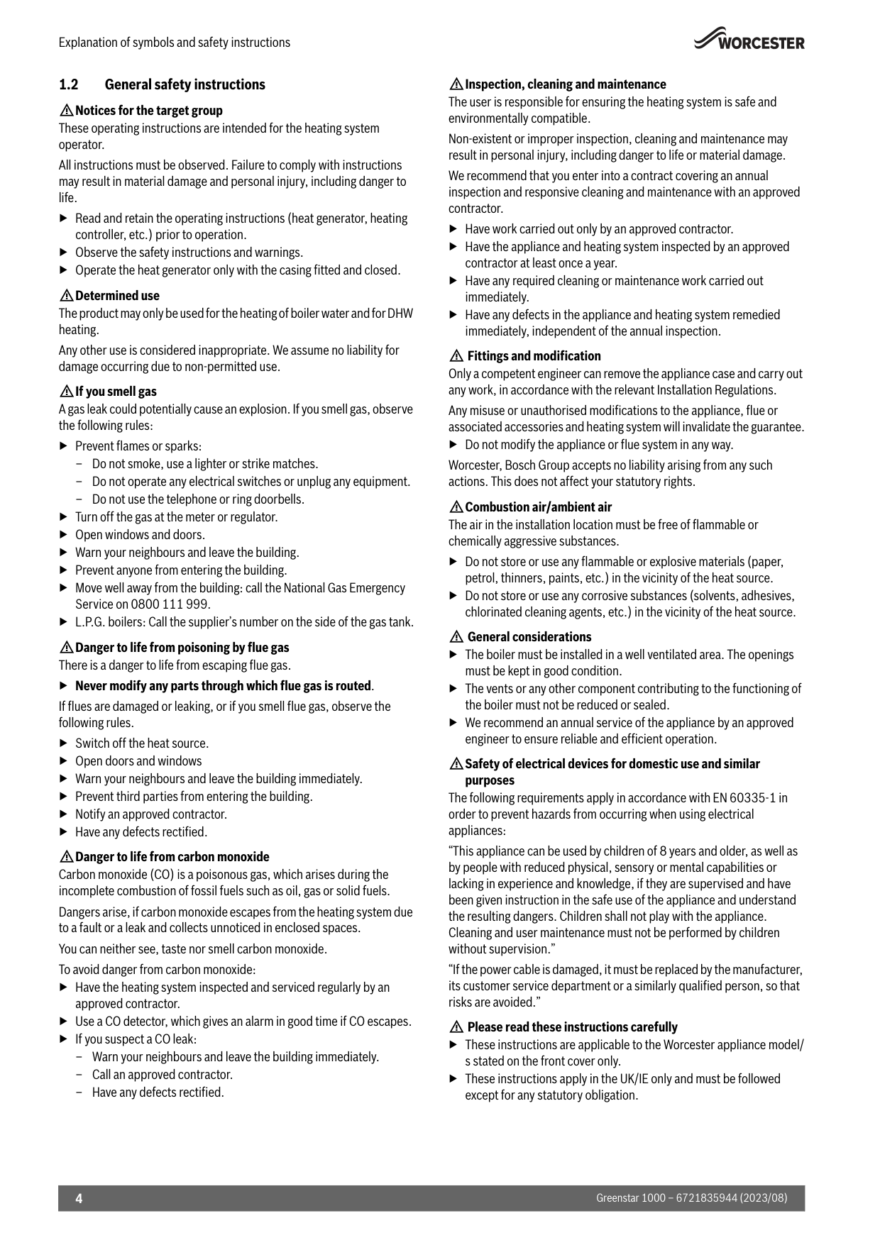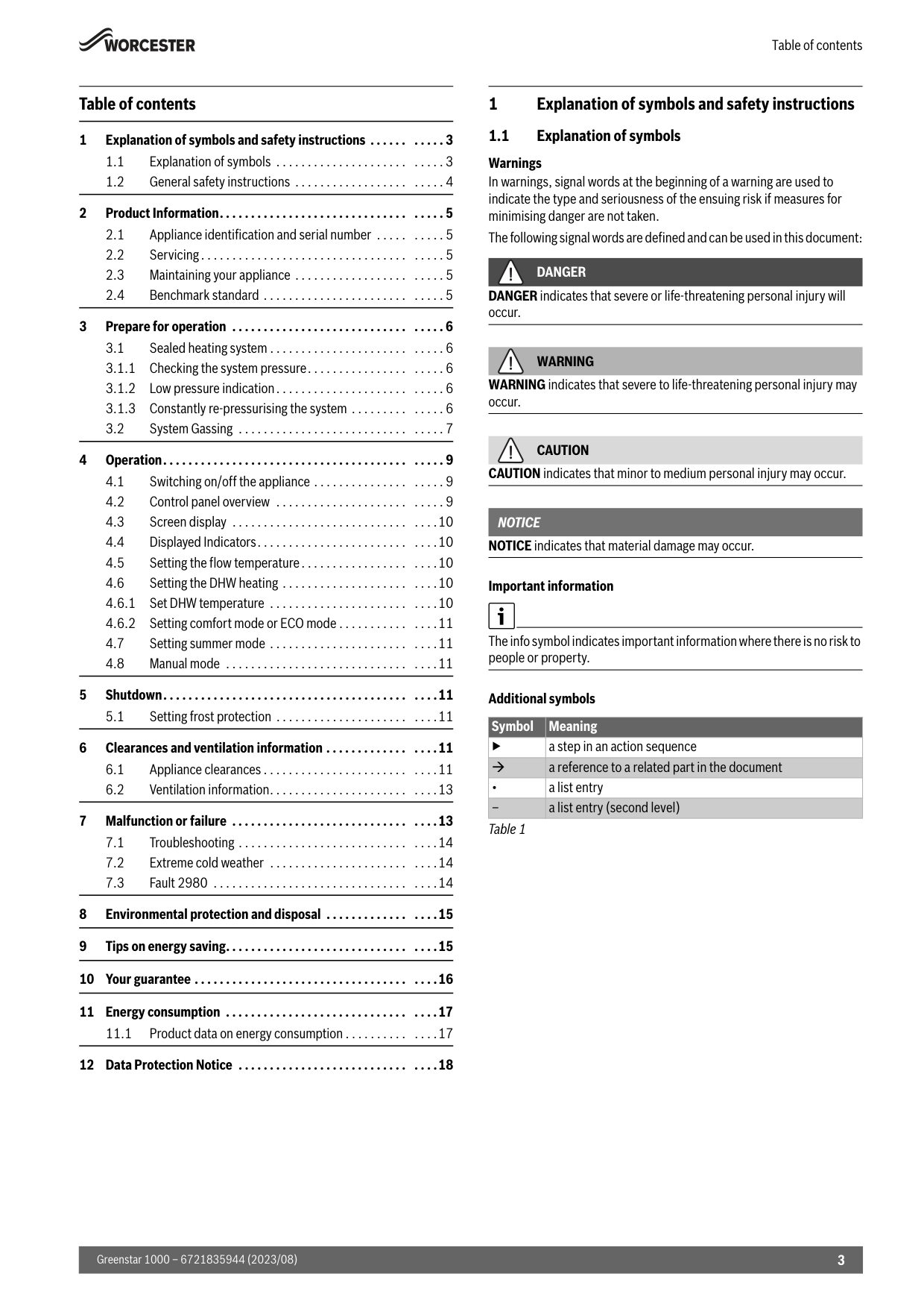 NOTICE indicates that material damage may occur. Important information The info symbol indicates important information where there is no risk to people or property. Additional symbols Table 1 1 Explanation of symbols and safety instructions . . . . . . . . . . . 3 1.1 Explanation of symbols . . . . . . . . . . . . . . . . . . . . . . . . . . 3 1.2 General safety instructions . . . . . . . . . . . . . . . . . . . . . . . 4 2 Product Information. . . . . . . . . . . . . . . . . . . . . . . . . . . . . . . . . . . 5 2.1 Appliance identification and serial number . . . . . . . . . . 5 2.2 Servicing. . . . . . . . . . . . . . . . . . . . . . . . . . . . . . . . . . . . . . 5 2.3 Maintaining your appliance . . . . . . . . . . . . . . . . . . . . . . . 5 2.4 Benchmark standard . . . . . . . . . . . . . . . . . . . . . . . . . . . . 5 3 Prepare for operation . . . . . . . . . . . . . . . . . . . . . . . . . . . . . . . . . 6 3.1 Sealed heating system . . . . . . . . . . . . . . . . . . . . . . . . . . . 6 3.1.1 Checking the system pressure. . . . . . . . . . . . . . . . . . . . . 6 3.1.2 Low pressure indication. . . . . . . . . . . . . . . . . . . . . . . . . . 6 3.1.3 Constantly re-pressurising the system . . . . . . . . . . . . . . 6 3.2 System Gassing . . . . . . . . . . . . . . . . . . . . . . . . . . . . . . . . 7 4 Operation. . . . . . . . . . . . . . . . . . . . . . . . . . . . . . . . . . . . . . . . . . . . 9 4.1 Switching on/off the appliance . . . . . . . . . . . . . . . . . . . . 9 4.2 Control panel overview . . . . . . . . . . . . . . . . . . . . . . . . . . 9 4.3 Screen display . . . . . . . . . . . . . . . . . . . . . . . . . . . . . . . .10 4.4 Displayed Indicators. . . . . . . . . . . . . . . . . . . . . . . . . . . .10 4.5 Setting the flow temperature. . . . . . . . . . . . . . . . . . . . .10 4.6 Setting the DHW heating . . . . . . . . . . . . . . . . . . . . . . . .10 4.6.1 Set DHW temperature . . . . . . . . . . . . . . . . . . . . . . . . . .10 4.6.2 Setting comfort mode or ECO mode . . . . . . . . . . . . . . .11 4.7 Setting summer mode . . . . . . . . . . . . . . . . . . . . . . . . . .11 4.8 Manual mode . . . . . . . . . . . . . . . . . . . . . . . . . . . . . . . . .11 5 Shutdown. . . . . . . . . . . . . . . . . . . . . . . . . . . . . . . . . . . . . . . . . . .11 5.1 Setting frost protection . . . . . . . . . . . . . . . . . . . . . . . . .11 6 Clearances and ventilation information . . . . . . . . . . . . . . . . .11 6.1 Appliance clearances . . . . . . . . . . . . . . . . . . . . . . . . . . .11 6.2 Ventilation information. . . . . . . . . . . . . . . . . . . . . . . . . .13 7 Malfunction or failure . . . . . . . . . . . . . . . . . . . . . . . . . . . . . . . .13 7.1 Troubleshooting . . . . . . . . . . . . . . . . . . . . . . . . . . . . . . .14 7.2 Extreme cold weather . . . . . . . . . . . . . . . . . . . . . . . . . .14 7.3 Fault 2980 . . . . . . . . . . . . . . . . . . . . . . . . . . . . . . . . . . .14 8 Environmental protection and disposal . . . . . . . . . . . . . . . . .15 9 Tips on energy saving. . . . . . . . . . . . . . . . . . . . . . . . . . . . . . . . .15 10 Your guarantee . . . . . . . . . . . . . . . . . . . . . . . . . . . . . . . . . . . . . .16 11 Energy consumption . . . . . . . . . . . . . . . . . . . . . . . . . . . . . . . . .17 11.1 Product data on energy consumption . . . . . . . . . . . . . .17 12 Data Protection Notice . . . . . . . . . . . . . . . . . . . . . . . . . . . . . . .18 Symbol Meaning ▶ a step in an action sequence a reference to a related part in the document • a list entry – a list entry (second level)Explanation of symbols and safety instructions Greenstar 1000 – 6721835944 (2023/08) 4 1.2 General safety instructions HNotices for the target group These operating instructions are intended for the heating system operator. All instructions must be observed. Failure to comply with instructions may result in material damage and personal injury, including danger to life. ▶Read and retain the operating instructions (heat generator, heating controller, etc.) prior to operation. ▶Observe the safety instructions and warnings. ▶Operate the heat generator only with the casing fitted and closed. HDetermined use The product may only be used for the heating of boiler water and for DHW heating. Any other use is considered inappropriate. We assume no liability for damage occurring due to non-permitted use. HIf you smell gas A gas leak could potentially cause an explosion. If you smell gas, observe the following rules: ▶Prevent flames or sparks: – Do not smoke, use a lighter or strike matches. – Do not operate any electrical switches or unplug any equipment. – Do not use the telephone or ring doorbells. ▶Turn off the gas at the meter or regulator. ▶Open windows and doors. ▶Warn your neighbours and leave the building. ▶Prevent anyone from entering the building. ▶Move well away from the building: call the National Gas Emergency Service on 0800 111 999. ▶L.P.G. boilers: Call the supplier’s number on the side of the gas tank. HDanger to life from poisoning by flue gas There is a danger to life from escaping flue gas. ▶Never modify any parts through which flue gas is routed. If flues are damaged or leaking, or if you smell flue gas, observe the following rules. ▶Switch off the heat source. ▶Open doors and windows ▶Warn your neighbours and leave the building immediately. ▶Prevent third parties from entering the building. ▶Notify an approved contractor. ▶Have any defects rectified. HDanger to life from carbon monoxide Carbon monoxide (CO) is a poisonous gas, which arises during the incomplete combustion of fossil fuels such as oil, gas or solid fuels. Dangers arise, if carbon monoxide escapes from the heating system due to a fault or a leak and collects unnoticed in enclosed spaces. You can neither see, taste nor smell carbon monoxide. To avoid danger from carbon monoxide: ▶Have the heating sys