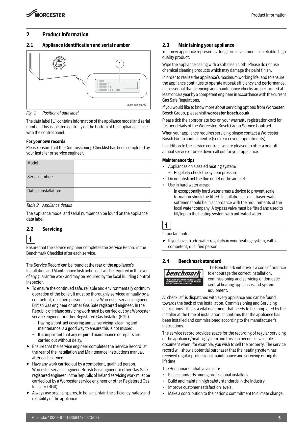 Product Information 5 Greenstar 1000 – 6721835944 (2023/08) 2 Product Information 2.1 Appliance identification and serial number Fig. 1 Position of data label The data label [1] contains information of the appliance model and serial number. This is located centrally on the bottom of the appliance in line with the control panel. For your own records Please ensure that the Commissioning Checklist has been completed by your installer or service engineer. Table 2 Appliance details The appliance model and serial number can be found on the appliance data label. 2.2 Servicing Ensure that the service engineer completes the Service Record in the Benchmark Checklist after each service. The Service Record can be found at the rear of the appliance’s Installation and Maintenance Instructions. It will be required in the event of any guarantee work and may be required by the local Building Control Inspector. ▶To ensure the continued safe, reliable and environmentally optimum operation of the boiler, it must be thoroughly serviced annually by a competent, qualified person, such as a Worcester service engineer, British Gas engineer or other Gas Safe registered engineer. In the Republic of Ireland servicing work must be carried out by a Worcester service engineer or other Registered Gas Installer (RGII). – Having a contract covering annual servicing, cleaning and maintenance is a good way to ensure this is not missed. – It is important that any required maintenance or repairs are carried out without delay. ▶Ensure that the service engineer completes the Service Record, at the rear of the Installation and Maintenance Instructions manual, after each service. ▶Have any work carried out by a competent, qualified person, Worcester service engineer, British Gas engineer or other Gas Safe registered engineer. In the Republic of Ireland servicing work must be carried out by a Worcester service engineer or other Registered Gas Installer (RGII). ▶Always use original spares, to help maintain the efficiency, safety and reliability of the appliance. 2.3 Maintaining your appliance Your new appliance represents a long term investment in a reliable, high quality product. Wipe the appliance casing with a soft clean cloth. Please do not use chemical cleaning products which may damage the paint finish. In order to realise the appliance’s maximum working life, and to ensure the appliance continues to operate at peak efficiency and performance, it is essential that servicing and maintenance checks are performed at least once a year by a competent engineer in accordance with the current Gas Safe Regulations. If you would like to know more about servicing options from Worcester, Bosch Group, please visit worcester-bosch.co.uk. Please tick the appropriate box on your warranty registration card for further details of the Worcester, Bosch Group Service Contract. When your appliance requires servicing please contact a Worcester, Bosch Group contact centre (see rear cover, appointments). In addition to the service contract we are pleased to offer a one-off annual service or breakdown call out for your appliance. Maintenance tips • Appliances on a sealed heating system: – Regularly check the system pressure. • Do not obstruct the flue outlet or the air inlet. • Use in hard water areas: – In exceptionally hard water areas a device to prevent scale formation should be fitted. Installation of a salt based water softener should be in accordance with the requirements of the local water company. A bypass valve must be fitted and used to fill/top up the heating system with untreated water. Important note: ▶If you have to add water regularly in your heating system, call a competent, qualified person. 2.4 Benchmark standard The Benchmark initiative is a code of practice to encourage the correct installation, commissioning and servicing of domestic central heating appliances and system equipment. A “checklist” is dispatched with every appliance and can be found towards the back of the Installation, Commissioning and Servicing Instructions. This is a vital document that needs to be completed by the installer at the time of installation. It confirms that the appliance has been installed and commissioned according to the manufacturer's instructions. The service record provides space for the recording of regular servicing of the appliance/heating system and this can become a valuable document when, for example, you wish to sell the property. The service record will show a potential purchaser that the heating system has received regular professional maintenance and servicing during its lifetime. The Benchmark initiative aims to: • Raise standards among professional installers. • Build and maintain high safety standards in the industry. • Improve customer satisfaction levels. • Make a contribution to the nation's commitment to climate change. Model: Serial number: Date of installation: x xxx xxx xxx-001 1