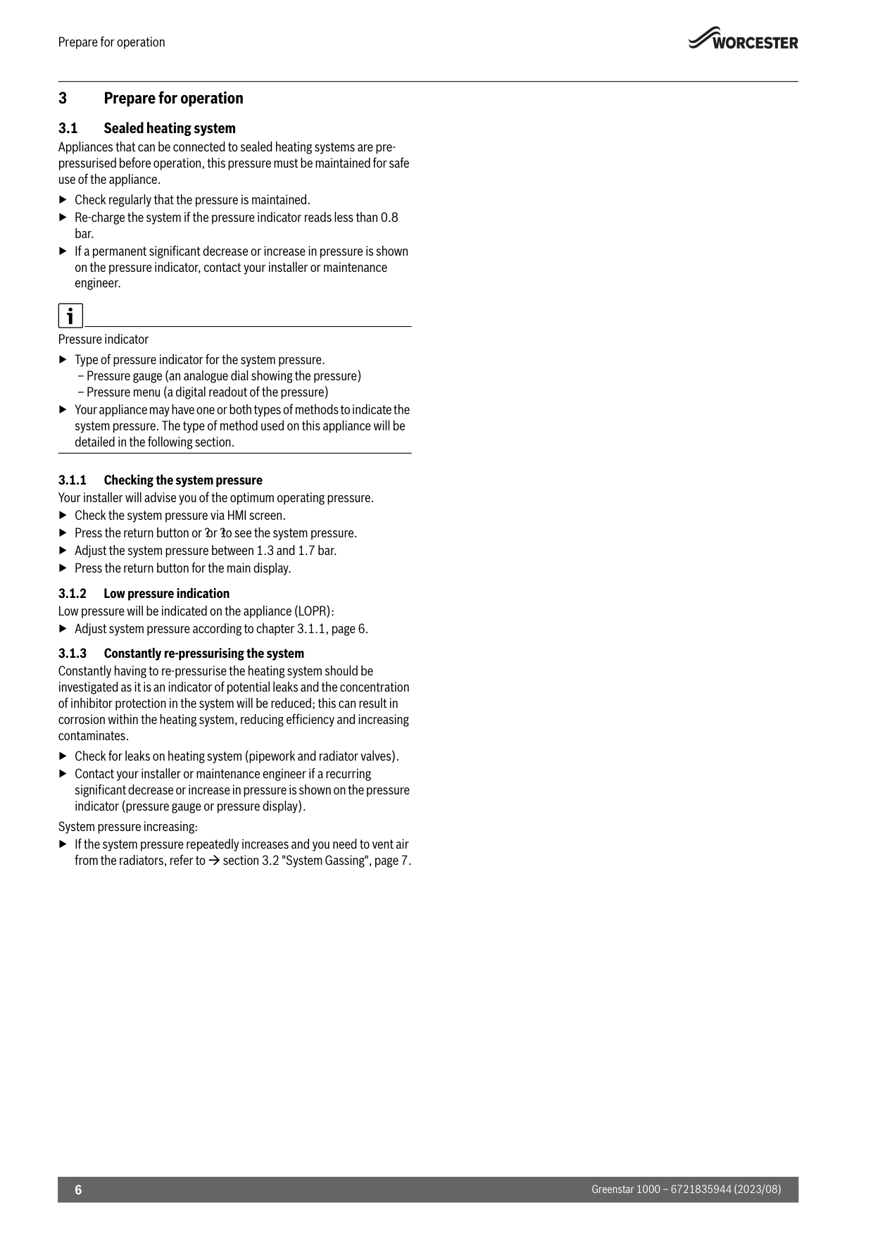 Prepare for operation Greenstar 1000 – 6721835944 (2023/08) 6 3 Prepare for operation 3.1 Sealed heating system Appliances that can be connected to sealed heating systems are pre- pressurised before operation, this pressure must be maintained for safe use of the appliance. ▶Check regularly that the pressure is maintained. ▶Re-charge the system if the pressure indicator reads less than 0.8 bar. ▶If a permanent significant decrease or increase in pressure is shown on the pressure indicator, contact your installer or maintenance engineer. Pressure indicator ▶Type of pressure indicator for the system pressure. – Pressure gauge (an analogue dial showing the pressure) – Pressure menu (a digital readout of the pressure) ▶Your appliance may have one or both types of methods to indicate the system pressure. The type of method used on this appliance will be detailed in the following section. 3.1.1 Checking the system pressure Your installer will advise you of the optimum operating pressure. ▶Check the system pressure via HMI screen. ▶Press the return button or ? or ? to see the system pressure. ▶Adjust the system pressure between 1.3 and 1.7 bar. ▶Press the return button for the main display. 3.1.2 Low pressure indication Low pressure will be indicated on the appliance (LOPR): ▶Adjust system pressure according to chapter 3.1.1, page 6. 3.1.3 Constantly re-pressurising the system Constantly having to re-pressurise the heating system should be investigated as it is an indicator of potential leaks and the concentration of inhibitor protection in the system will be reduced; this can result in corrosion within the heating system, reducing efficiency and increasing contaminates. ▶Check for leaks on heating system (pipework and radiator valves). ▶Contact your installer or maintenance engineer if a recurring significant decrease or increase in pressure is shown on the pressure indicator (pressure gauge or pressure display). System pressure increasing: ▶If the system pressure repeatedly increases and you need to vent air from the radiators, refer to section 3.2 "System Gassing", page 7.