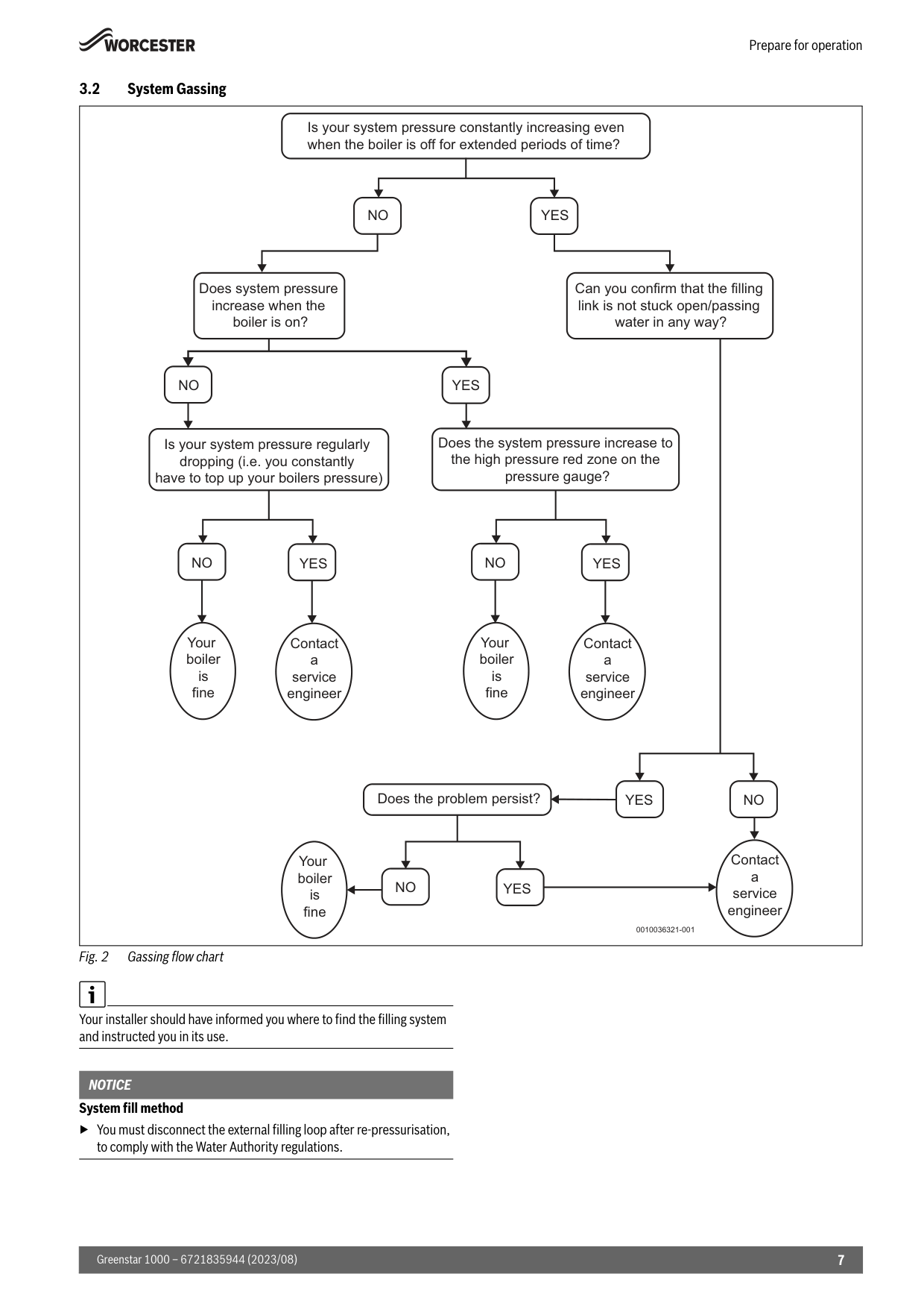 Prepare for operation 7 Greenstar 1000 – 6721835944 (2023/08) 3.2 System Gassing Fig. 2 Gassing flow chart Your installer should have informed you where to find the filling system and instructed you in its use.
