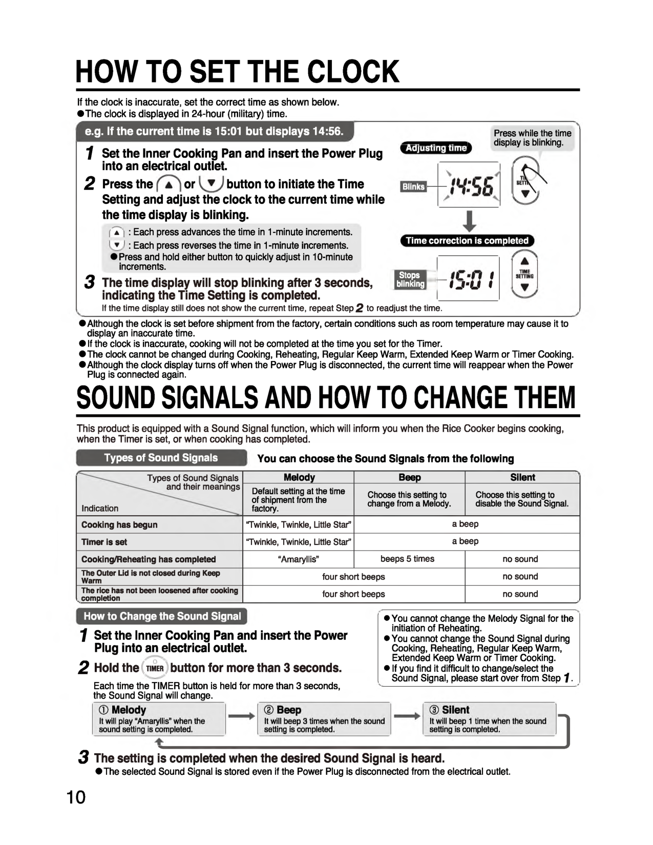 Time correction is completed If the clock is inaccurate, set the correct time as shown below. •The clock is displayed in 24-hour (military) time. e.g. If the current time is 15:01 but displays 14:56. Press while the time display is blinking. 1 Set the Inner Cooking Pan and insert the Power Plug into an electrical outlet. 2 Press the or button to initiate the Time Setting and adjust the clock to the current time while the time display is blinking. |[T) : Each press advances the time in 1-minute increments. : Each press reverses the time in 1 -minute increments. • Press and hold either button to quickly adjust in 10-minute increments. 3 The time display will stop blinking after 3 seconds, indicating the Time Setting is completed. If the time display still does not show the current time, repeat Step 2 to readjust the time. •Although the clock is set before shipment from the factory, certain conditions such as room temperature may cause it to display an inaccurate time. • If the clock is inaccurate, cooking will not be completed at the time you set for the Timer. •The clock cannot be changed during Cooking, Reheating, Regular Keep Warm, Extended Keep Warm or Timer Cooking. •Although the clock display turns off when the Power Plug is disconnected, the current time will reappear when the Power Plug is connected again.Sound Signals And How To Change Them