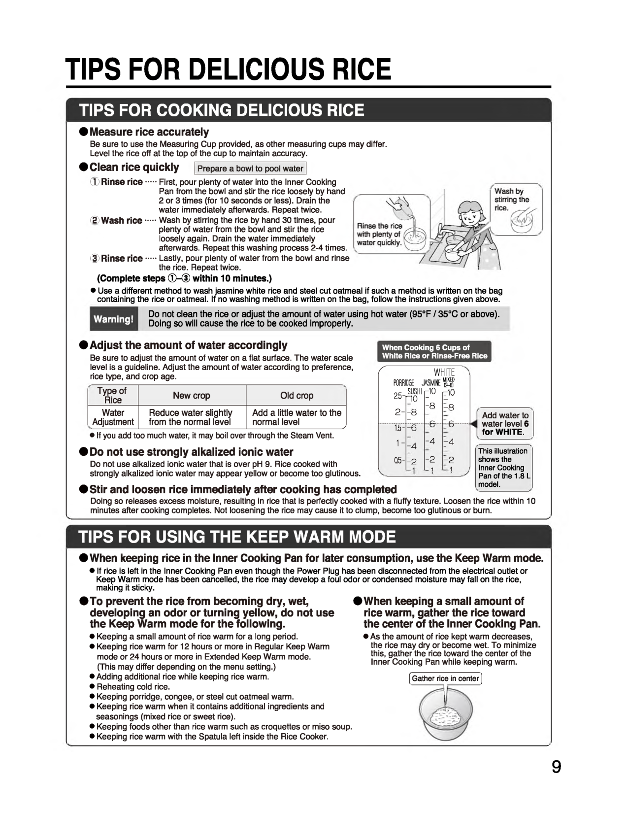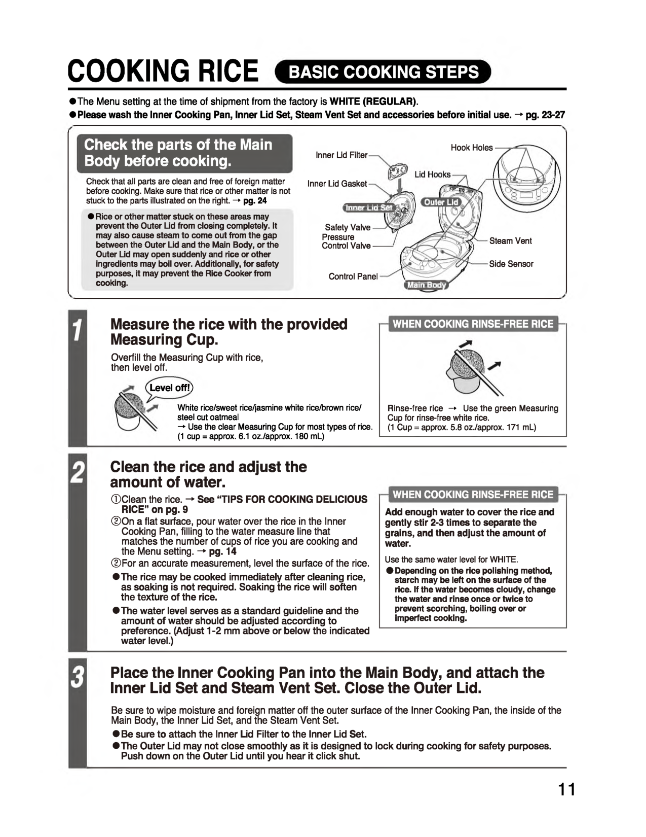 Rinse-free rice → Us e the green Measuring Cu p for rinse-free white rice. (1 Cup = approx. 5.8 oz./approx. 171 mL)2 Clean the rice and adjust the amount of water. 1Clean the rice. → See “TIPS FOR COOKING DELICIOUS RICE” on pg. 9 2On a flat surface, pour water over the rice in the Inner Cooking Pan, filling to the water measure line that matches the number of cups of rice you are cooking and the Menu setting. → pg. 14 3For an accurate measurement, level the surface of the rice. •T he rice may be cooked immediately after cleaning rice, as soaking is not required. Soaking the rice will soften the texture of the rice. •T he water level serves as a standard guideline and the amount of water should be adjusted according to preference. (Adjust 1 -2 mm above or below the indicated water level.)When Cooking Rinse-Free Rice