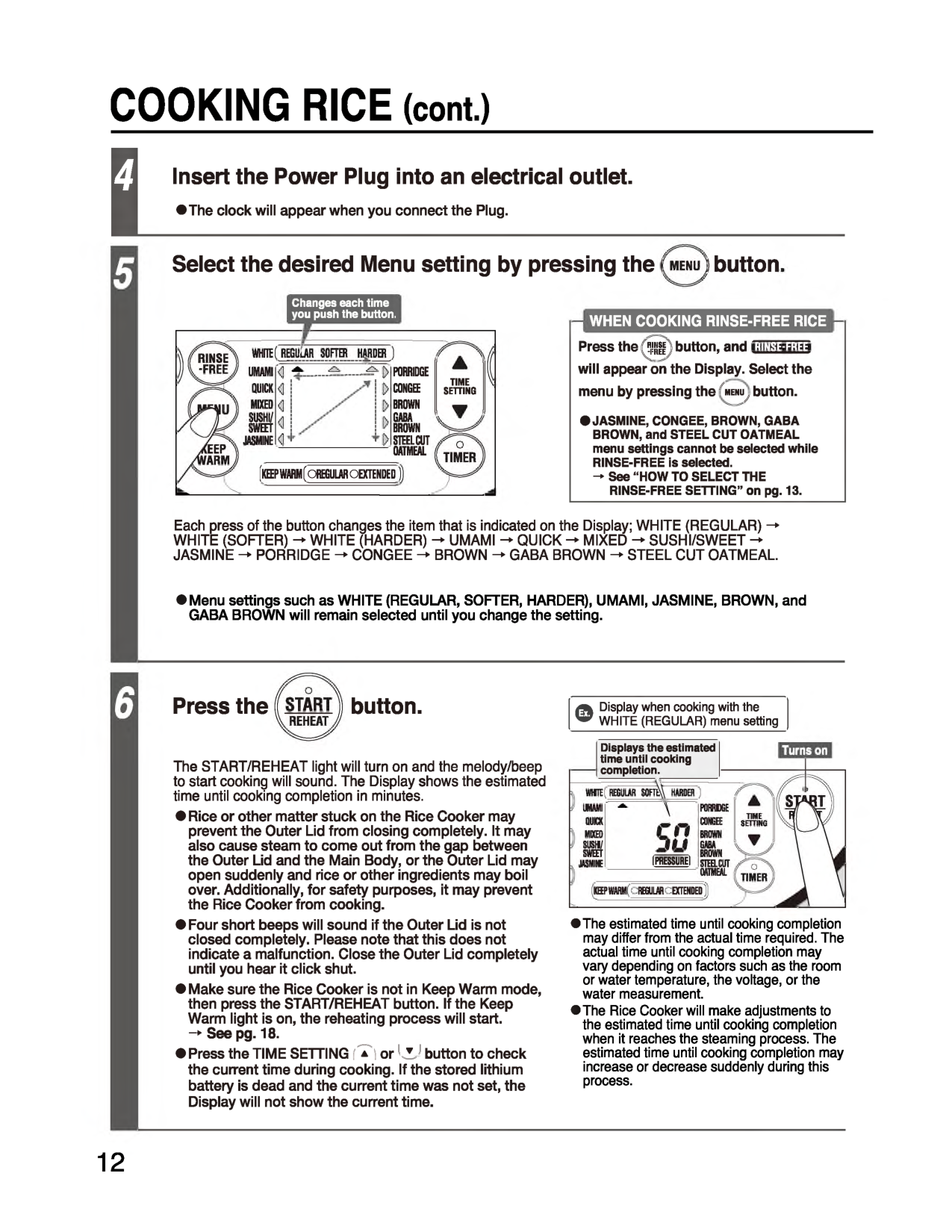 Add enough water to cover the rice and gently stir 2-3 times to separate the grains, and then adjust the amount of water. Use the same water level for WHITE.COOKING RICE (cont.) 14 Insert the Power Plug into an electrical outlet. •T he clock will appear when you connect the Plug.5 Select the desired Menu setting by pressing the ME NU button. ) Changes each time you push the button.