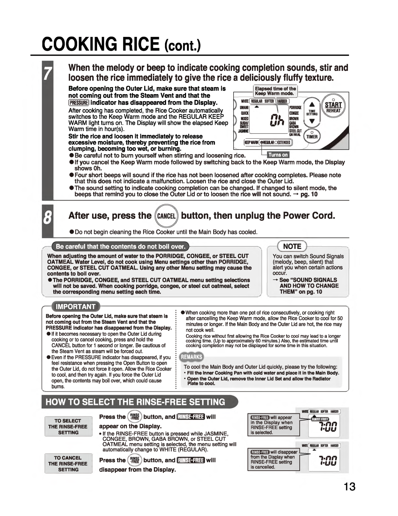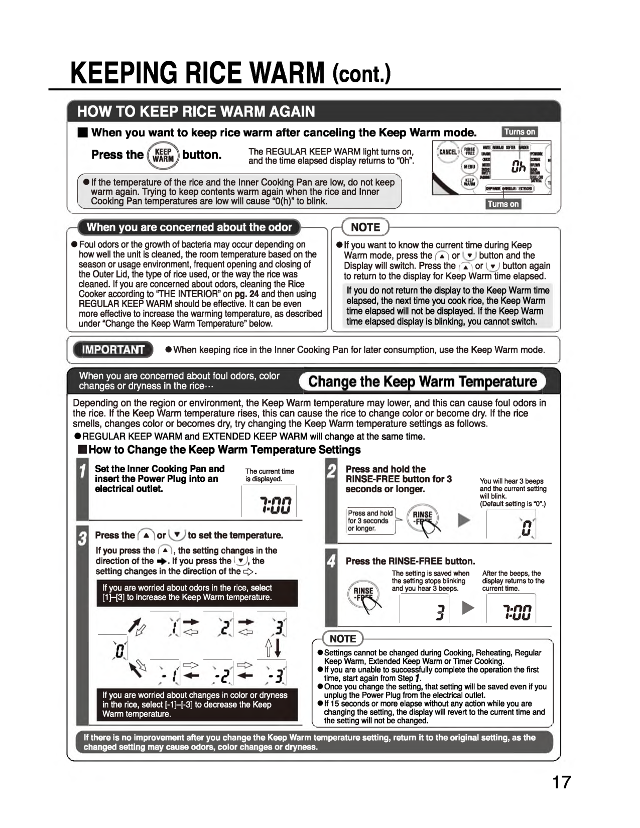 This keeps the rice warm at a higher temperature, so the rice develops odors less easily. When cooking completes, the Rice Cooker automatically switches to Regular Keep Warm mode and the REGULAR KEEP WARM light turns on.Extended Keep Warm