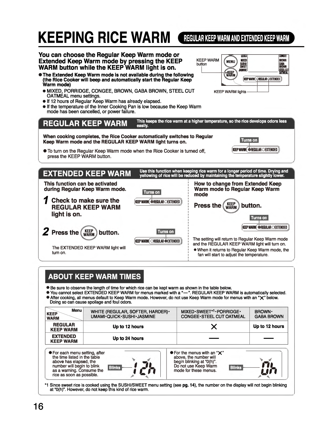 light is on.2Press the KEEP WARM button. The EXTENDED KEEP WARM light will turn on. Turns on (KgWftRHfeREGULABOEXTENDED f Turns on (ro W ftlM fÕ R im ftR «EXTENDED j How to change from Extended Keep Warm mode to Regular Keep Warm mode Press the KEEP WARM button. Turns on (i(EffWAHMf«REGULftROEXTEHDED ]) The setting will return to Regular Keep Warm mode and the REGULAR KEEP WARM light will turn on.About Keep Warm Times