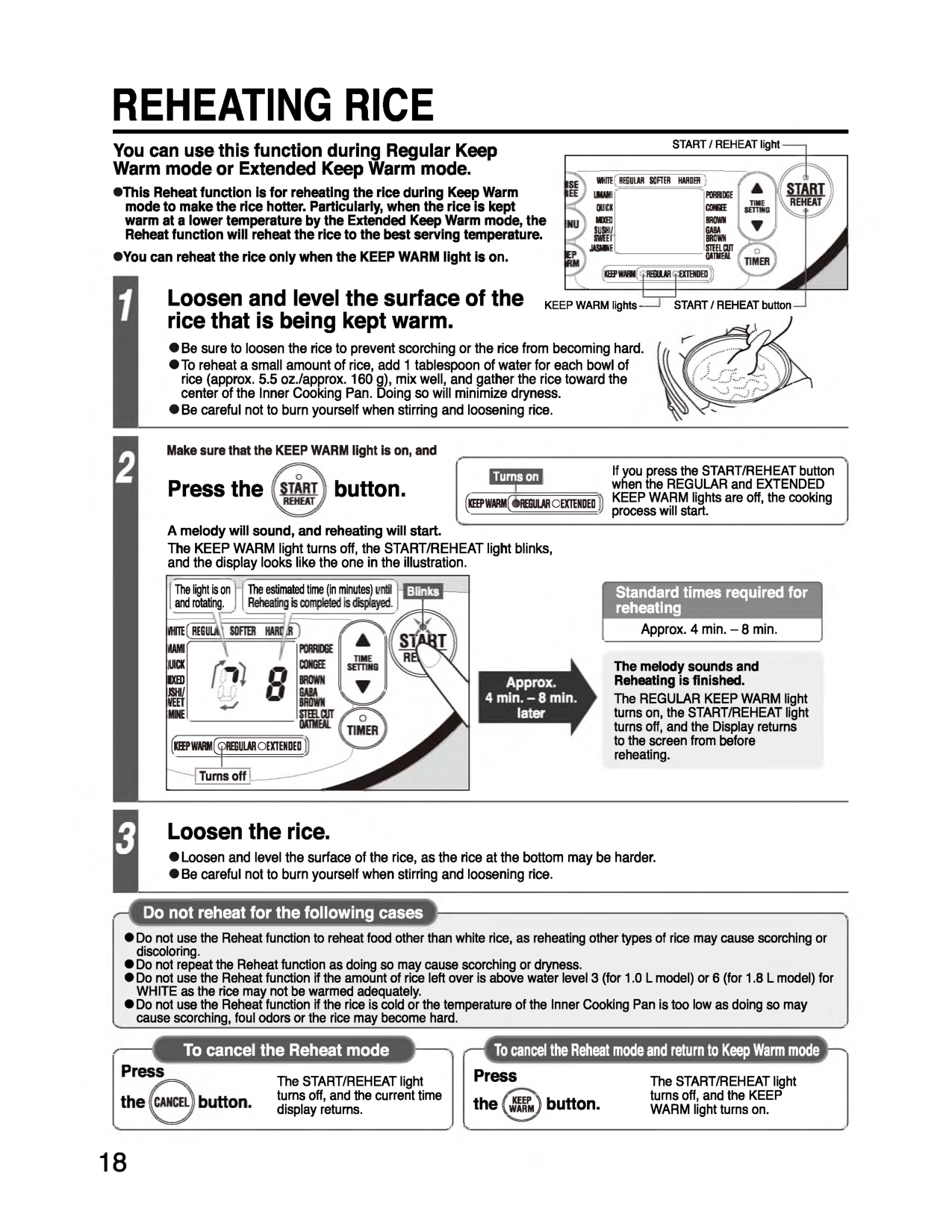 (k f f P WARM (^REGULftR OEXTENDED Turns o ff___ Standard times required for reheating Approx. 4 min. - 8 min. The melody sounds and Reheating is finished. The REGULAR KEEP WARM light turns on, the START/REHEAT light turns off, and the Display returns to the screen from before reheating.3 Loosen the rice. •Loosen and level the surface of the rice, as the rice at the bottom may be harder.