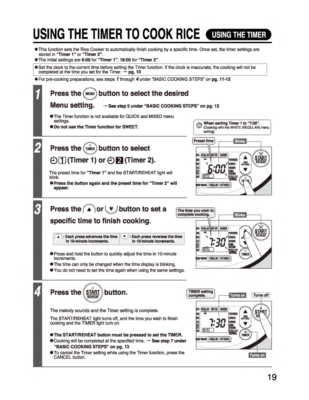 © When setting Timer 1 to “7:30”. (Cooking with the WHITE (REGULAR) menu setting)2 Press the T I MER b utton to select ©[1] (Timer 1) or © 0 (Timer 2). The preset time for “Timer 1” and the START/REHEAT light will blink.