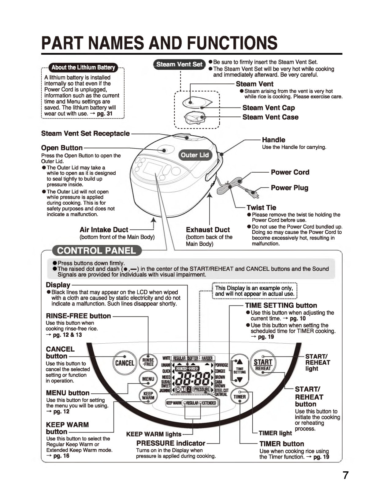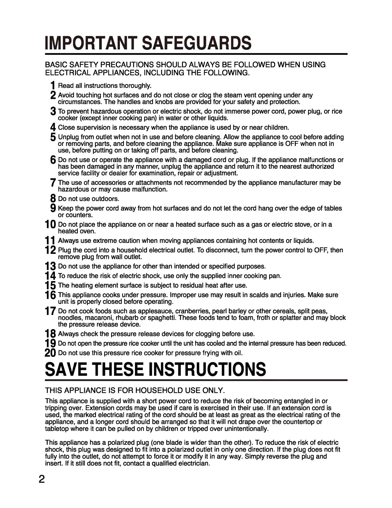 1 Read all instructions thoroughly. 2 Avoid touching hot surfaces and do not close or clog the steam vent opening under any circumstances. The handles and knobs are provided for your safety and protection. 3 To prevent hazardous operation or electric shock, do not immerse power cord, power plug, or rice cooker (except inner cooking pan) in water or other liquids. 4 Close supervision is necessary when the appliance is used by or near children. 5 Unplug from outlet when not in use and before cleaning. Allow the appliance to cool before adding or removing parts, and before cleaning the appliance. Make sure appliance is OFF when not in use, before putting on or taking off parts, and before cleaning. 0 Do not use or operate the appliance with a damaged cord or plug. If the appliance malfunctions or has been damaged in any manner, unplug the appliance and return it to the nearest authorized service facility or dealer for examination, repair or adjustment. 7 The use of accessories or attachments not recommended by the appliance manufacturer may be hazardous or may cause malfunction. 8 Do not use outdoors. 9 Keep the power cord away from hot surfaces and do not let the cord hang over the edge of tables or counters. 10 Do not place the appliance on or near a heated surface such as a gas or electric stove, or in a heated oven. 11 Always use extreme caution when moving appliances containing hot contents or liquids. 12 Plug the cord into a household electrical outlet. To disconnect, turn the power control to OFF, then remove plug from wall outlet. 13 Do not use the appliance for other than intended or specified purposes. 14 To reduce the risk of electric shock, use only the supplied inner cooking pan. 15 The heating element surface is subject to residual heat after use. 16 This appliance cooks under pressure. Improper use may result in scalds and injuries. Make sure unit is properly closed before operating. 17 Do not cook foods such as applesauce, cranberries, pearl barley or other cereals, split peas, noodles, macaroni, rhubarb or spaghetti. These foods tend to foam, froth or splatter and may block the pressure release device. 18 Always check the pressure release devices for clogging before use. 19 Do not open the pressure rice cooker until the unit has cooled and the internal pressure has been reduced. 20 Do not use this pressure rice cooker for pressure frying with oil.Save These Instructions