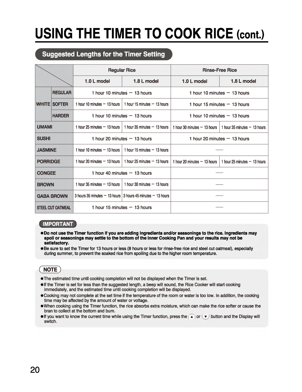 USING THE TIMER TO COOK RICE (cont.) Suggested Lengths for the Timer Setting Regular Rice Rinse-Free Rice 1.0 L model 1.8 L model 1.0 L model 1.8 L model