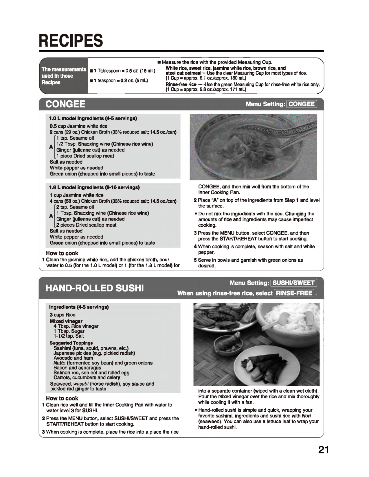 r The measurements used In these Recipes 11■ Tablespoon = 0.5 oz. (15 mL) 1■1 teaspoon = 0.2 oz. (5 mL)■ Measure the rice with the provided Measuring Cup. White rice, sweet rice, jasmine white rice, brown rice, and steel cut oatmeal-’Use the clear Measuring Cup for most types of rice. (1 Cup = approx. 6.1 ozJapprox. 180 mL) Rinse-free rice......Use the green Measuring Cup for rinse-free white rice only (1 Cup = approx. 5.8 ozJapprox. 171 mL)_____________________________ JCongee