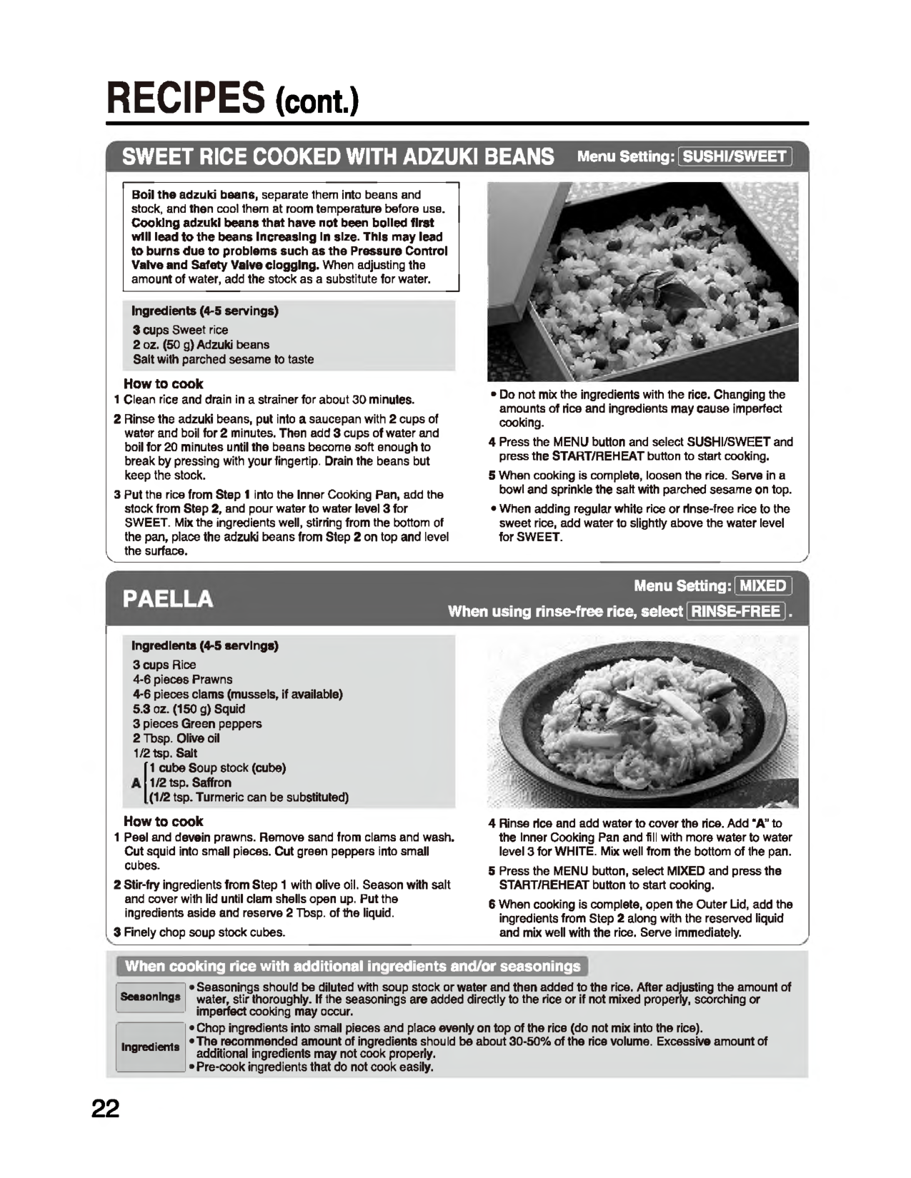 Menu Setting: SUSHI/SWEET Boil the adzuki beans, separate them into beans and stock, and then cool them at room temperature before use. Cooking adzuki beans that have not been boiled first will lead to the beans Increasing In size. This may lead to burns due to problems such as the Pressure Control Valve and Safety Valve clogging. When adjusting the amount of water, add the stock as a substitute for water. Ingredients (4-5 servings) 3 cups Sweet rice 2 oz. (50 g) Adzuki beans Salt with parched sesame to taste How to cook 1 Clean rice and drain in a strainer for about 30 minutes. 2 Rinse the adzuki beans, put into a saucepan with 2 cups of water and boil for 2 minutes. Then add 3 cups of water and boil for 20 minutes until the beans become soft enough to break by pressing with your fingertip. Drain the beans but keep the stock. 3 Put the rice from Step 1 into the Inner Cooking Pan, add the stock from Step 2, and pour water to water level 3 for SWEET. Mix the ingredients well, stirring from the bottom of the pan, place the adzuki beans from Step 2 on top and level the surface.____________________________________________ ^Cleaning And Maintenance