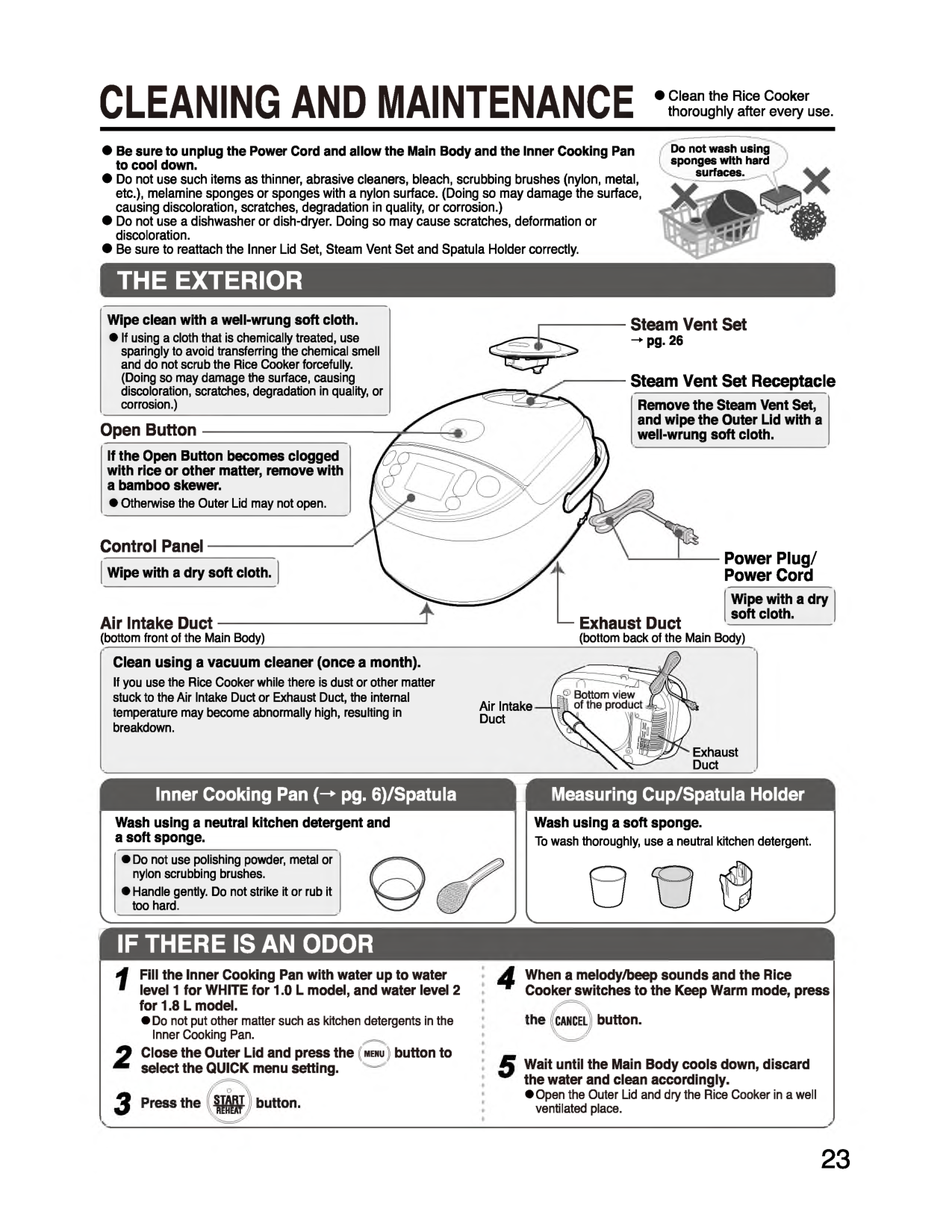Remove rice or other matter with a bamboo skewer.CLEANING AND MAINTENANCE (cont.) HOW TO CLEAN THE STEAM VENT SET Please allow the Rice Cooker to cool down before cleaning. Wash the outside and inside of the Steam Vent Set under running water. ( h o w t o d et ac h t h e s t e a m v e n t s e t ) Hold the rear part and pull up.
