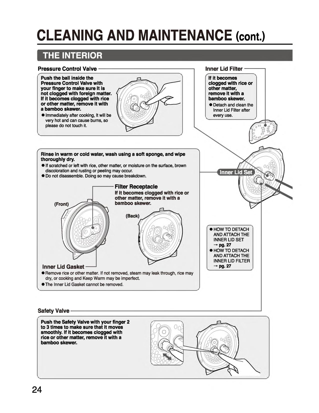 Insert a toothpick in the small opening to remove the Steam Vent Gasket. ê H O W T O A TTACH I Attach the Steam Vent Gasket to the groove of the Steam Vent Cap firmly. Make sure that the Steam Vent Gasket is not twisted. •A n incorrectly attached Steam Vent Gasket may cause steam or condensation to leak. 26CLEANING AND MAINTENANCE (cont.)