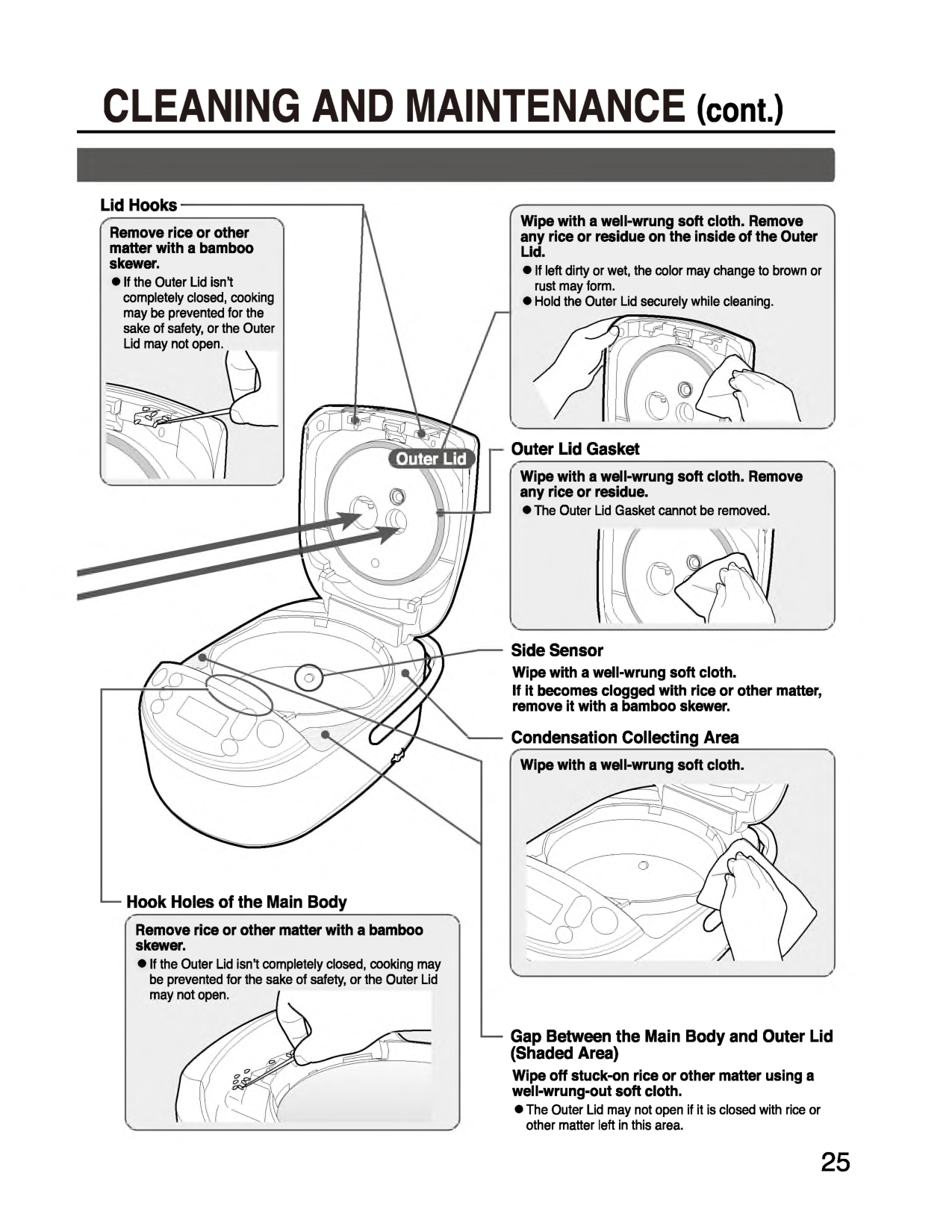 LEANING AND MAINTENANCE (cont.) Lid Hooks Side Sensor Condensation Collecting Area — Hook Holes of the Main Body — Gap Between the Main Body and Outer Lid (Shaded Area)