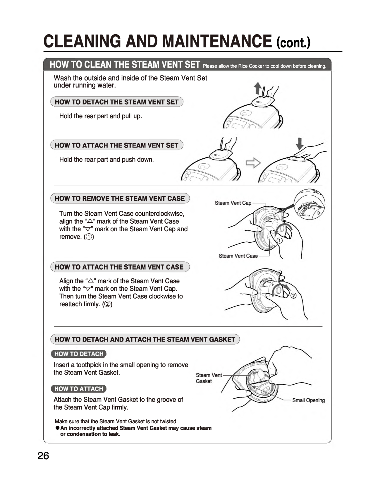 Turn the Steam Vent Case counterclockwise, align the “A ” mark of the Steam Vent Case with the “v ” mark on the Steam Vent Cap and remove. (©) ( h o w TO ATTACH THE STEAM VENT CASE ) Align the “A ” mark of the Steam Vent Case with the “v ” mark on the Steam Vent Cap. Then turn the Steam Vent Case clockwise to reattach firmly. (©) ( h o w TO DETACH AND ATTACH THE STEAM VENT GASKEHOW TO DETACHT)I