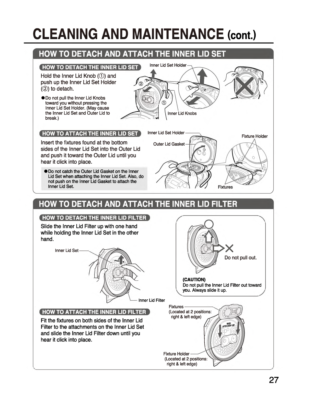 Fit the fixtures on both sides of the Inner Lid Filter to the attachments on the Inner Lid Set and slide the Inner Lid Filter down until you hear it click into place. Fixtures - (Located at 2 positions: right & left edge) Fixture Holder (Located at 2 positions: right & left edge) 27Troubleshooting Guide
